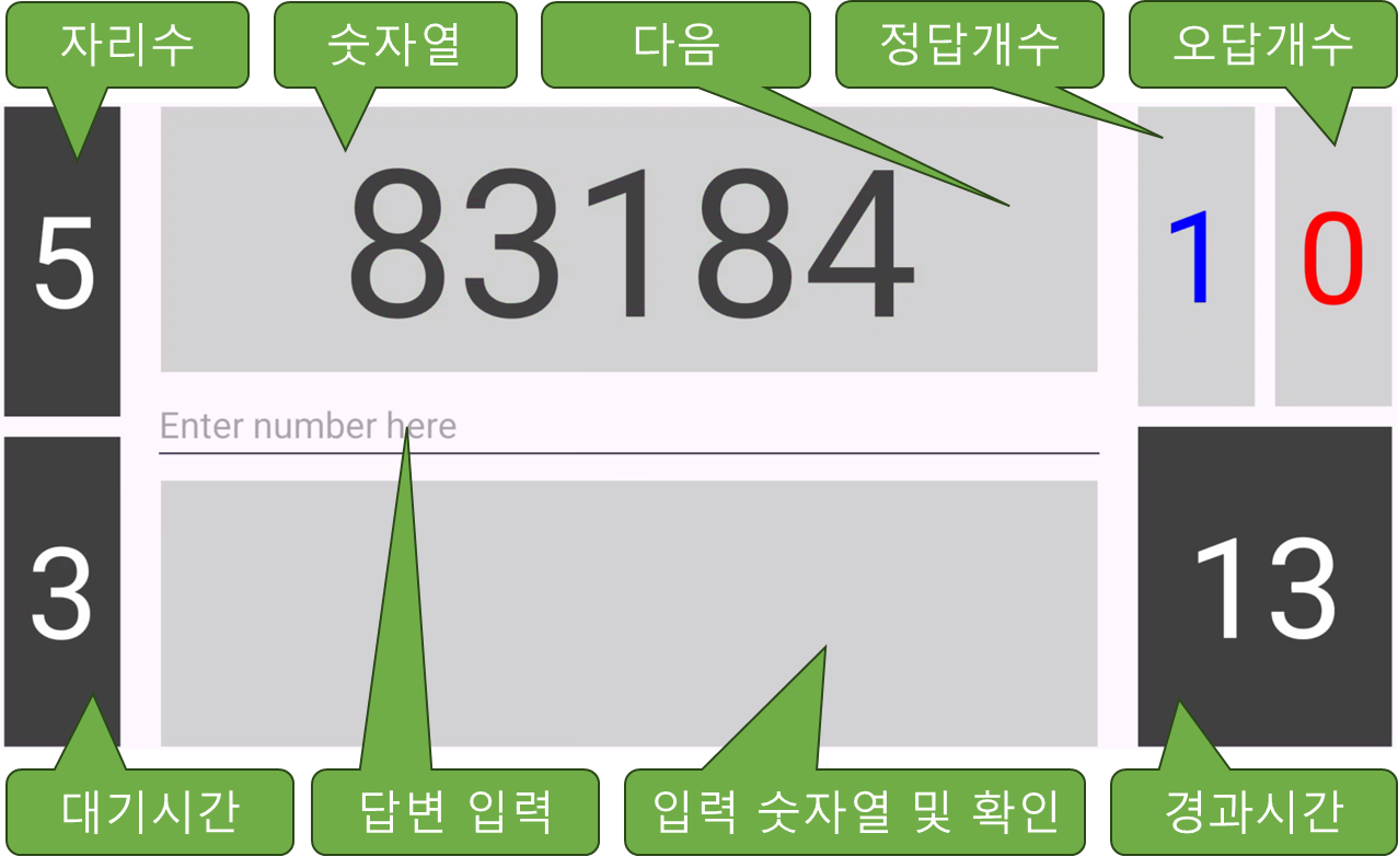 (표시 시간은 설정 가능) - 문제의 자리수가 많을수록 문제 표시 시간이 짧을수록 난이도가 올라감.