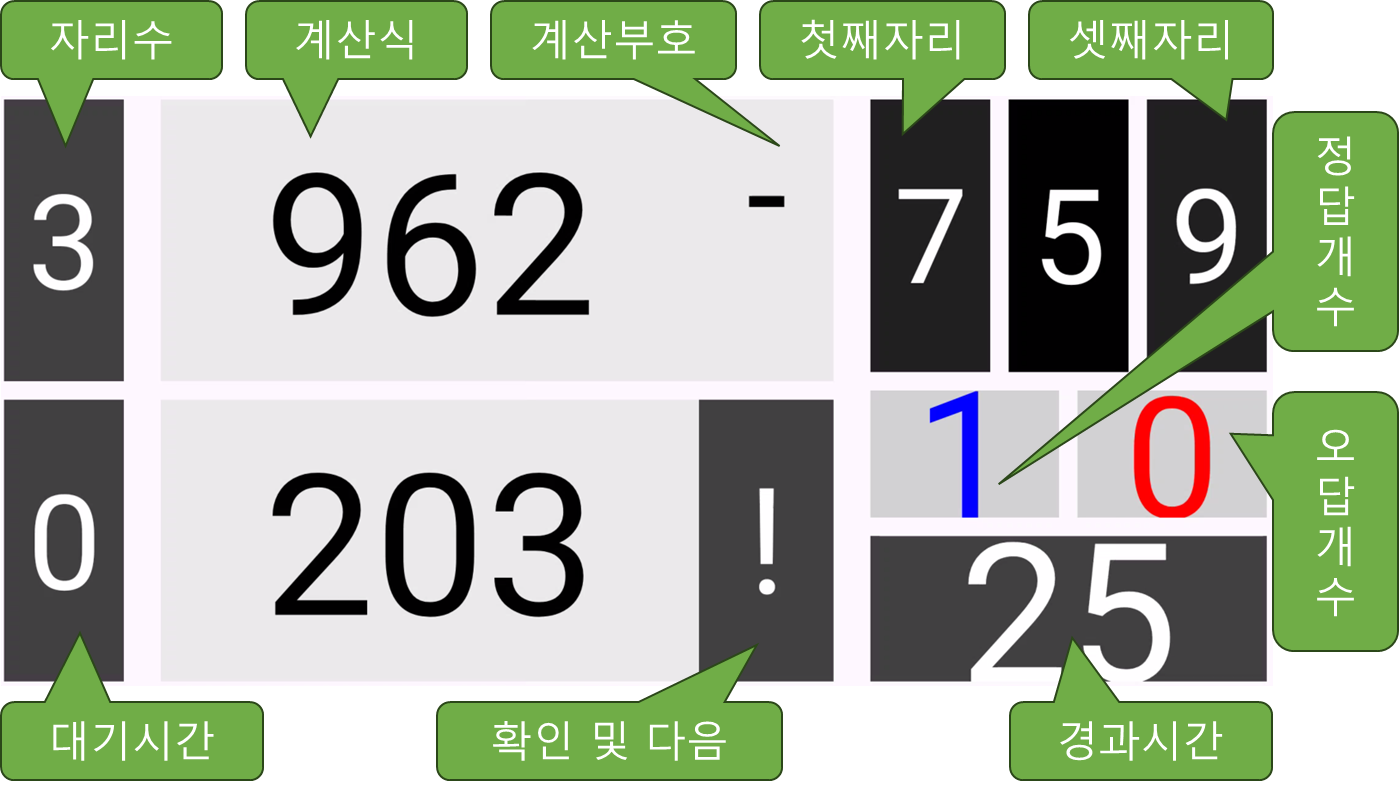 문제의 자리수가 많을수록 문제 표시 시간이 짧을수록 난이도가 높아짐.