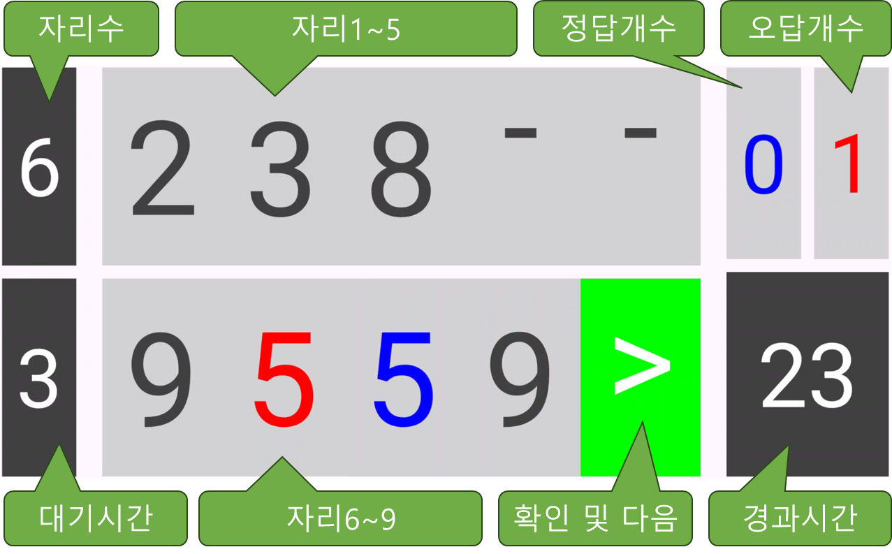 (표시 시간은 설정 가능) - 문제의 자리수가 많을수록 문제 표시 시간이 짧을수록 난이도가 올라감.