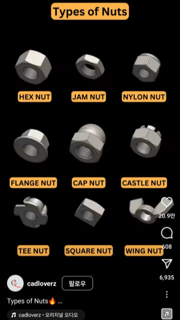 Hex nut, Jam nut, Nylon nut, Flange nut, Cap nut, Castle nut, Tee nut, Square nut, Wing nut