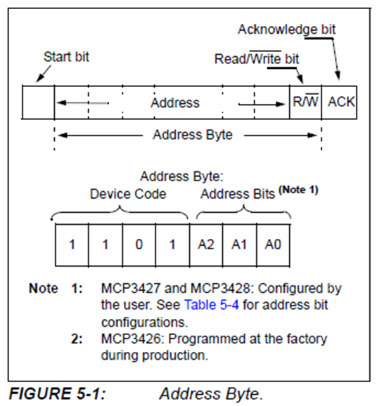 - 2 채널의 고정 주소인 MCP3426과 2 채널을 프로그래머블 주소를 갖는 MCP3427, 4 채널이면서 프로그래머블 주소를 갖는 MCP3428 등 3가지 종류가 있음.