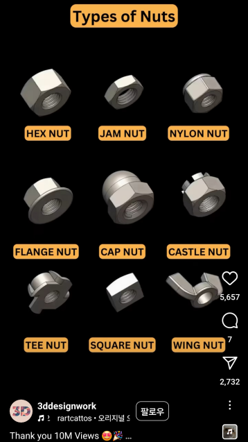 | 윙 너트 | 양쪽에 날개 모양의 돌출부가 있는 너트 손으로 쉽게 조이고 풀 수 있도록 설계됨. |