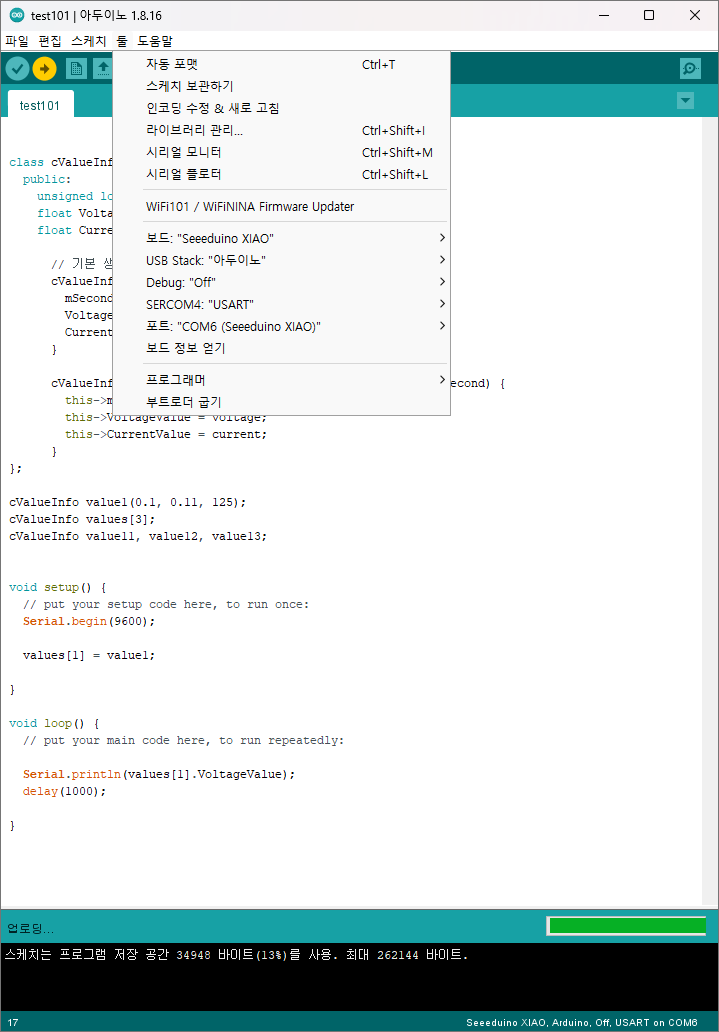 [Seeedstudio XIAO SAMD21 프로그래밍 화면]