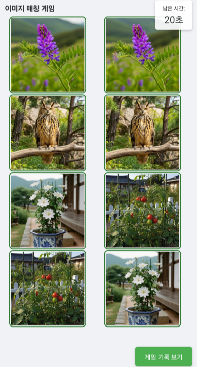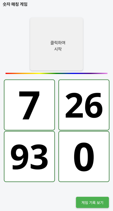 숫자 매칭 게임 남은 시간 : 초 게임 기록 보기