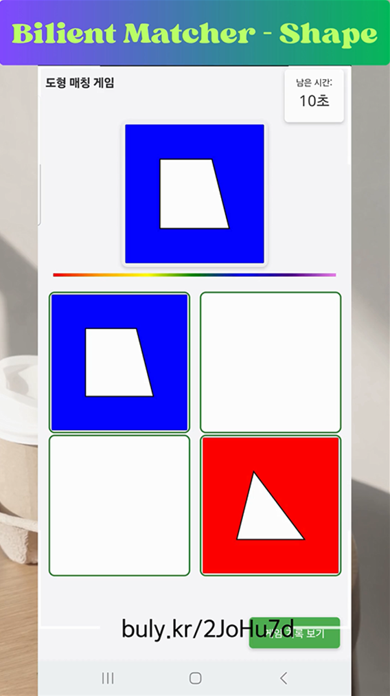 도형 매칭 게임(Bilient Matcher - Shape)는 시각적 도형 인식 능력과 기억력을 동시에 자극하는 맞춤형 매칭 게임입니다.