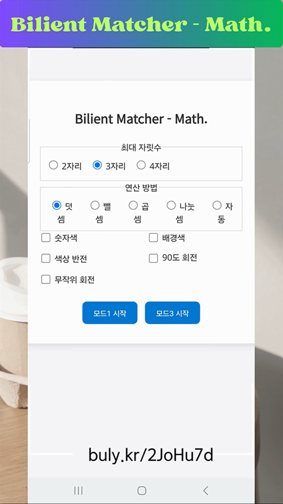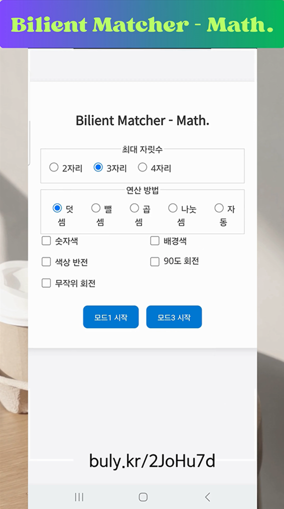 - 연산 유형 선택 가능 : 덧셈, 뺄셈, 곱셈, 나눗셈 또는 자동(random)