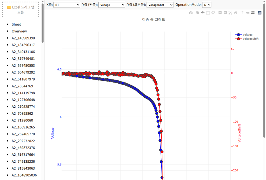 이 웹페이지는 사용자가 **Excel 파일을 웹브라우저에서 직접 업로드하고, 선택한 열 데이터를 기반으로 이중 축 그래프(Dual-Axis Plot)**를 시각화할 수 있도록 설계된 인터랙티브 데이터 시각화 도구입니다. Plotly.js와 XLSX.js 라이브러리를 활용하여 데이터를 실시간으로 시각화하며, OperationMode 필터링 기능도 제공됩니다.