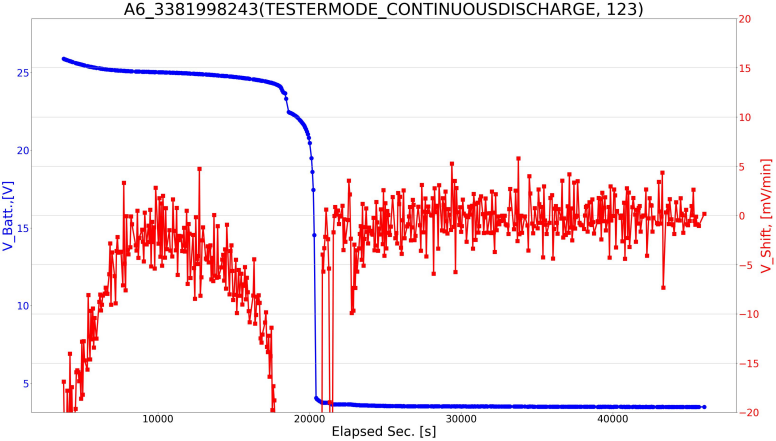 - 목적: 배터리의 연속 방전 중 전압(V_Batt) 변화와 전압 변화율(V_Shift)의 시간 경과에 따른 거동 분석