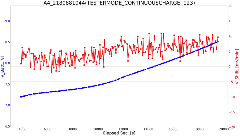 - 목적: 배터리 충전 중 전압(V_Batt) 상승 및 전압 변화율(V_Shift)의 시간 경과에 따른 거동 분석