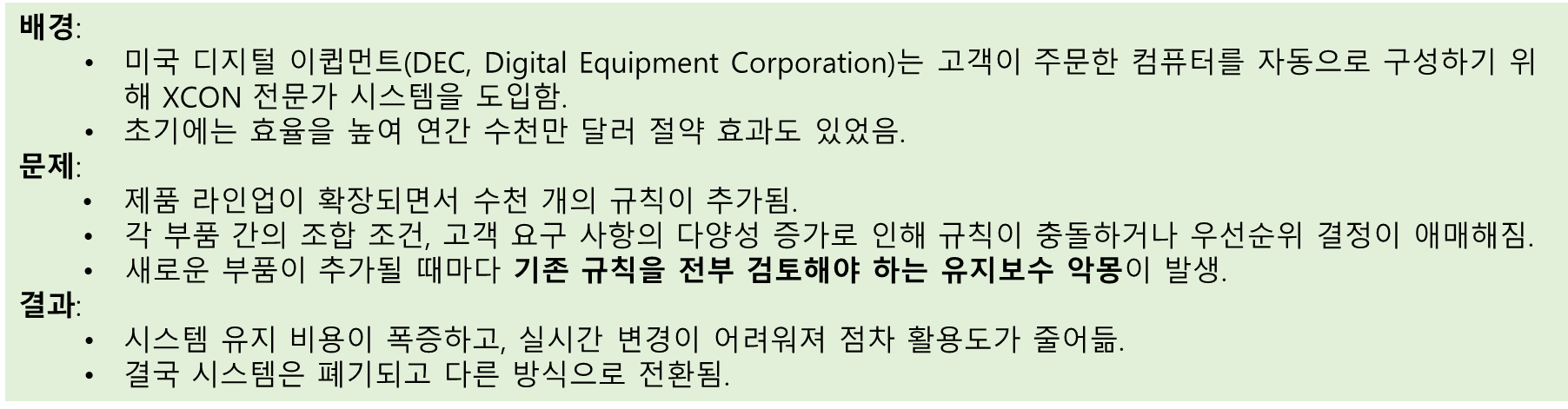 - 대표 사례: XCON (DEC사, 1980년대 중반)