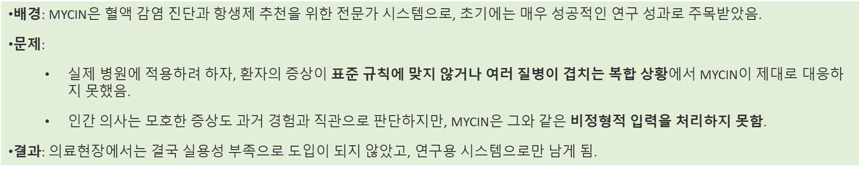 - 대표 사례: MYCIN (1970s–1980s)