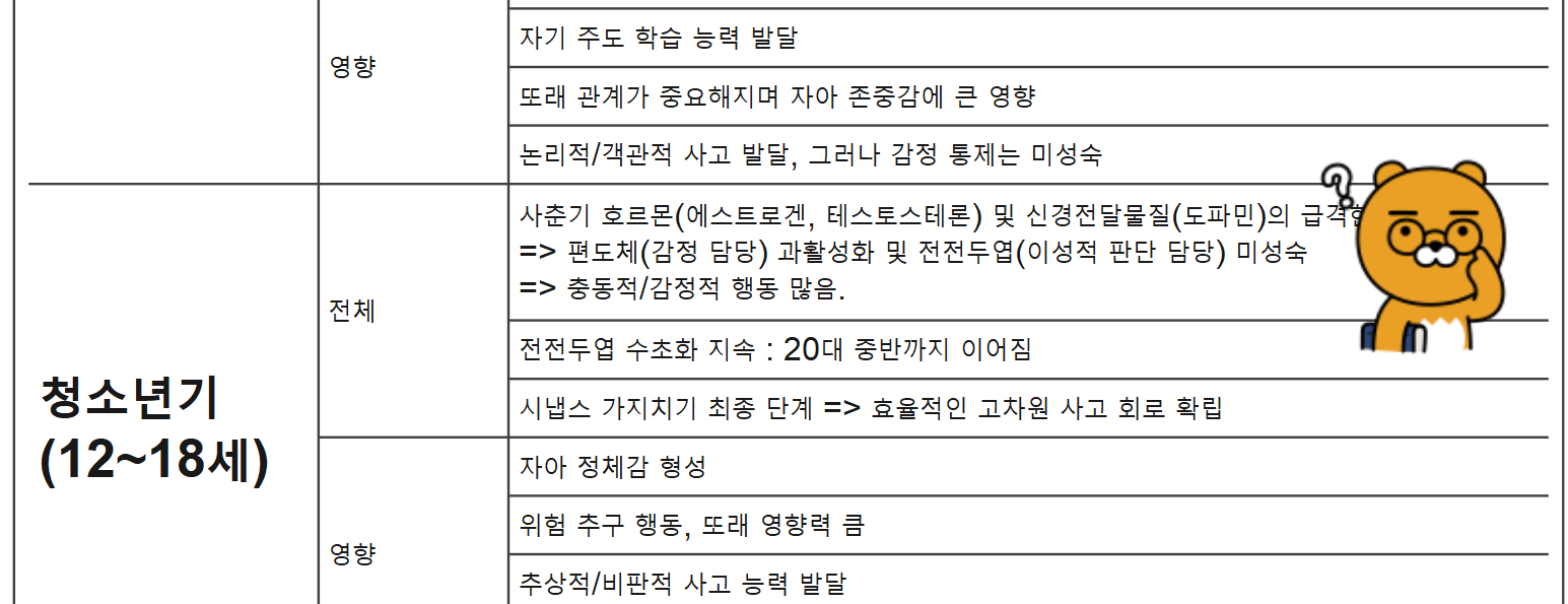 - 사춘기에는 이성적인 판단, 충동 조절, 계획 수립 등을 담당하는 전두엽이 활발하게 재구조화됨.