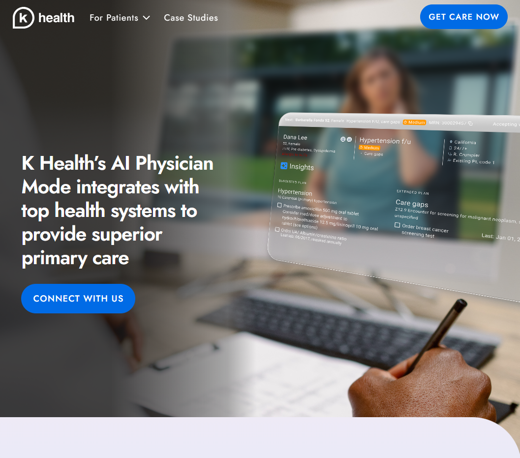 - 환자 관리 및 개인 건강 : K Health AI Symptom Checker, Buoy Health Assistant, Babylon Health GP at Hand, Noom AI Coach