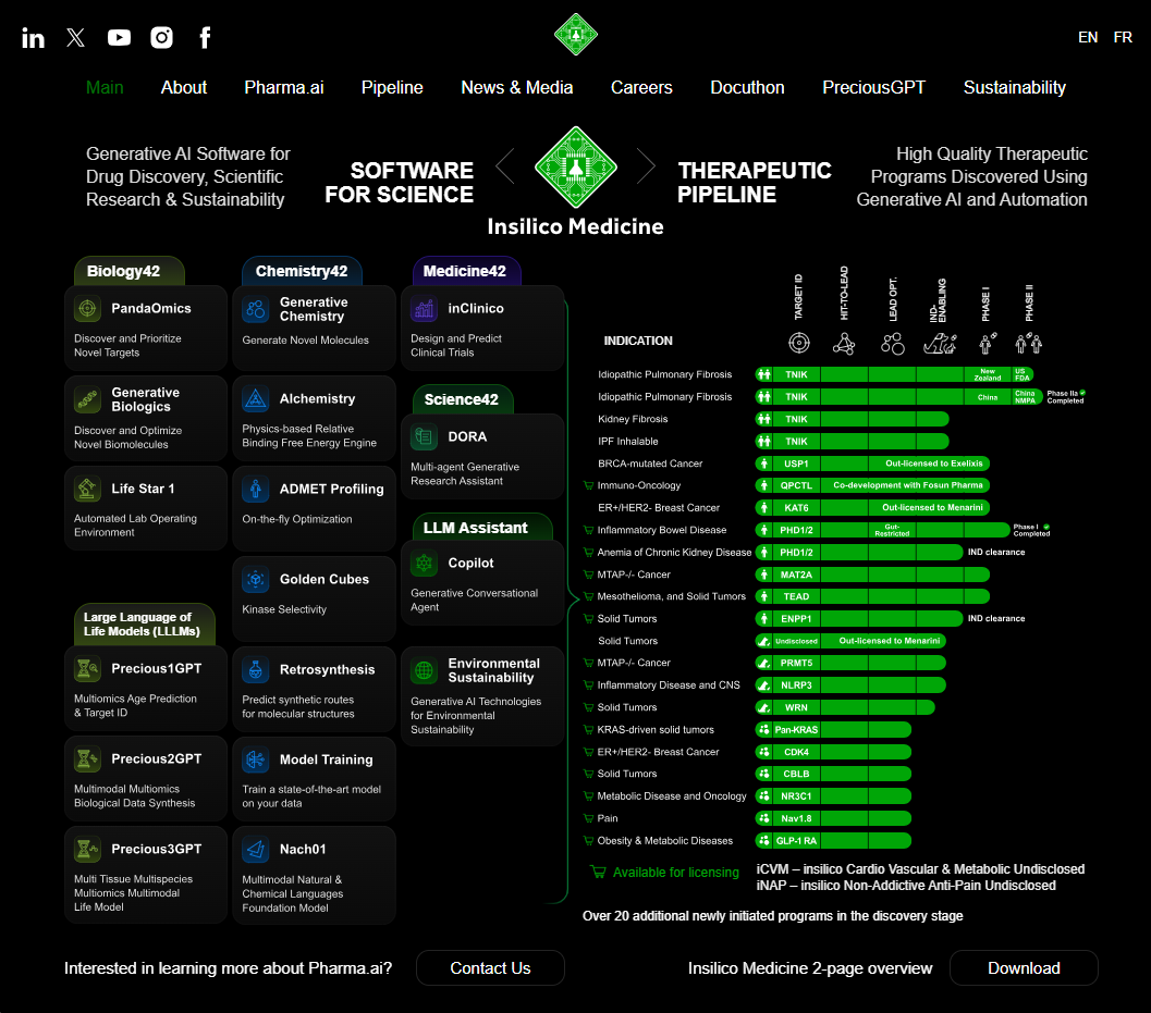 | 신약 개발을 위한 AI 플랫폼. 질병의 원인 물질을 찾아내고, 그에 맞는 신약 후보 물질을 생성하며, 임상시험 결과를 예측하여 신약 개발에 필요한 시간과 비용을 획기적으로 줄이는 데에 기여 |