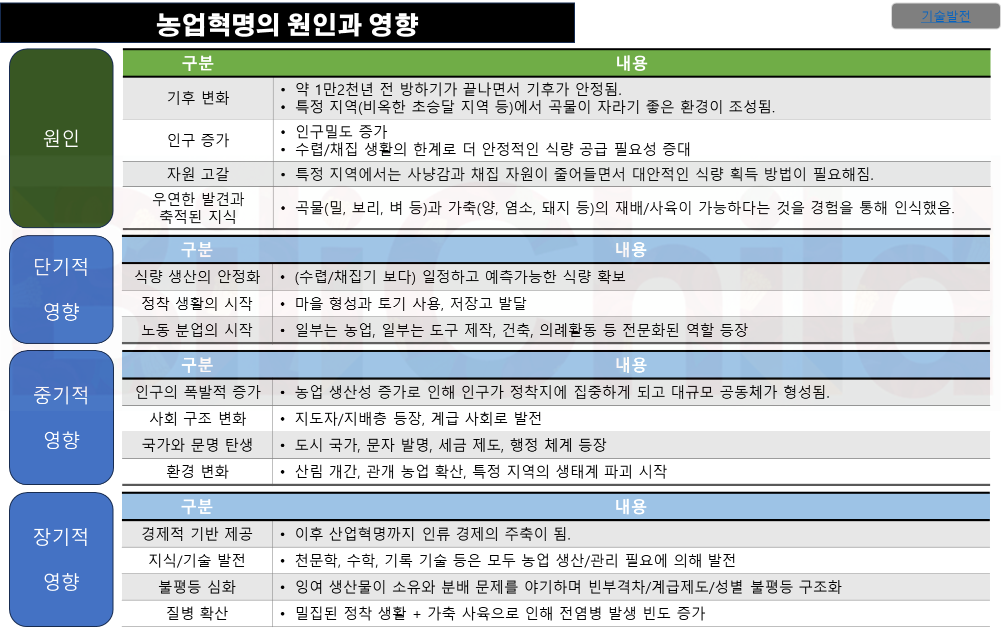 •곡물(밀, 보리, 벼 등)과 가축(양, 염소, 돼지 등)의 재배/사육이 가능하다는 것을 경험을 통해 인식했음.