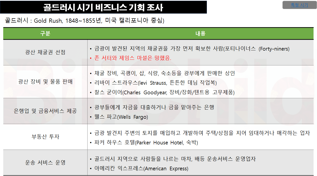 •금광 발견지 주변의 토지를 매입하고 개발하여 주택/상점을 지어 임대하거나 매각하는 업자