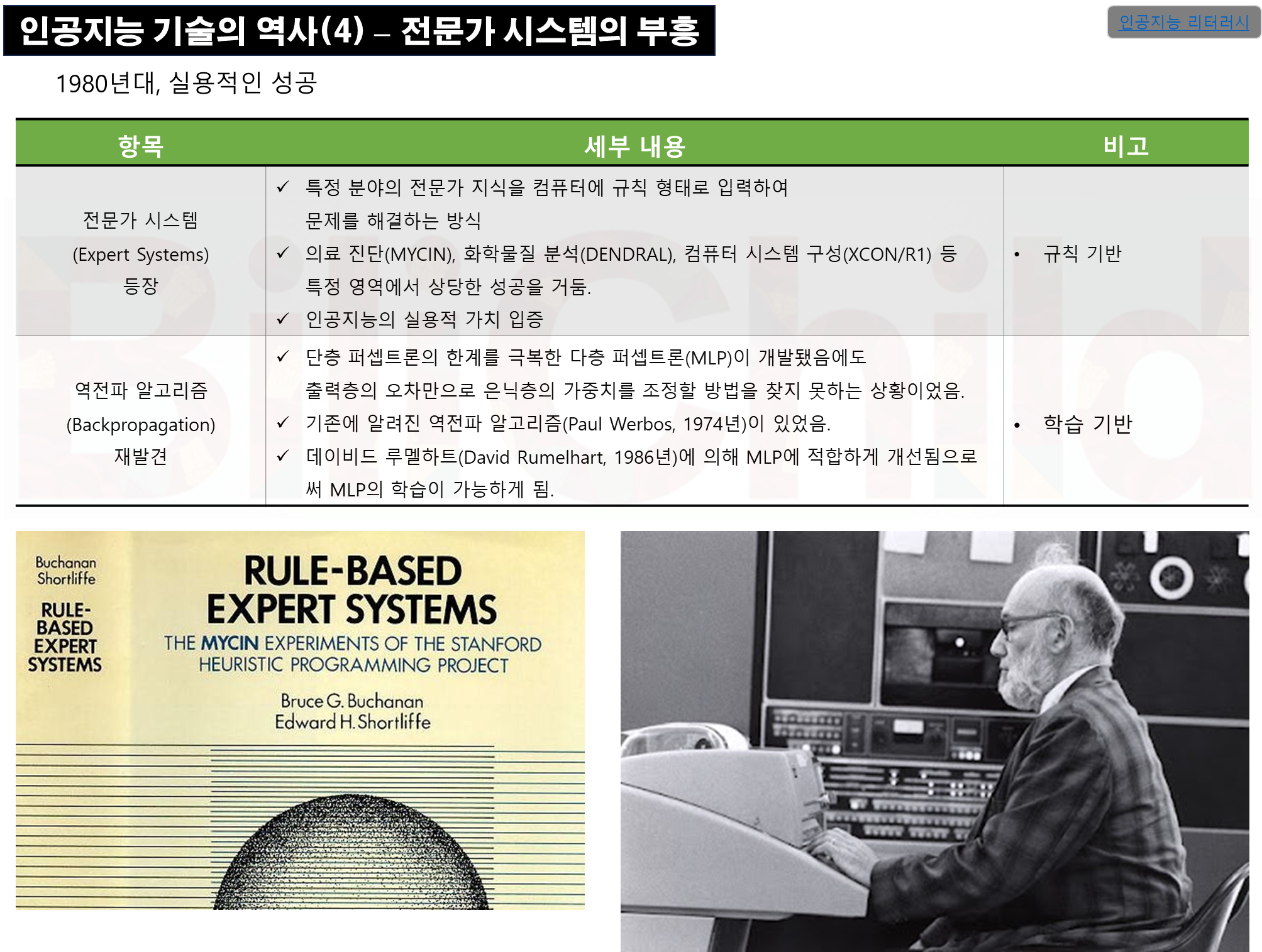 문제를 해결하는 방식 ü의료 진단(MYCIN), 화학물질 분석(DENDRAL), 컴퓨터 시스템 구성(XCON/R1) 등