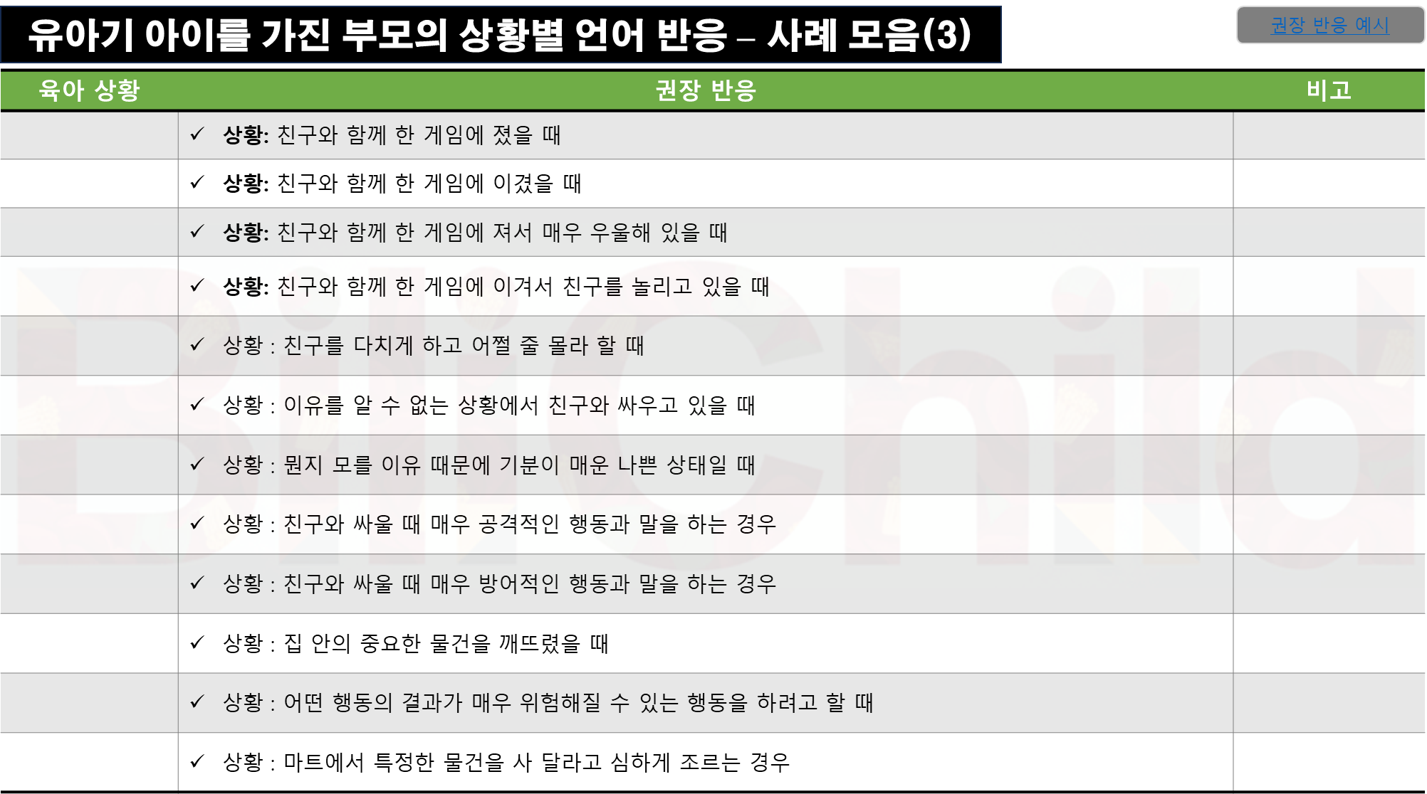 | 육아 상황 | 권장 반응 | 비고 |