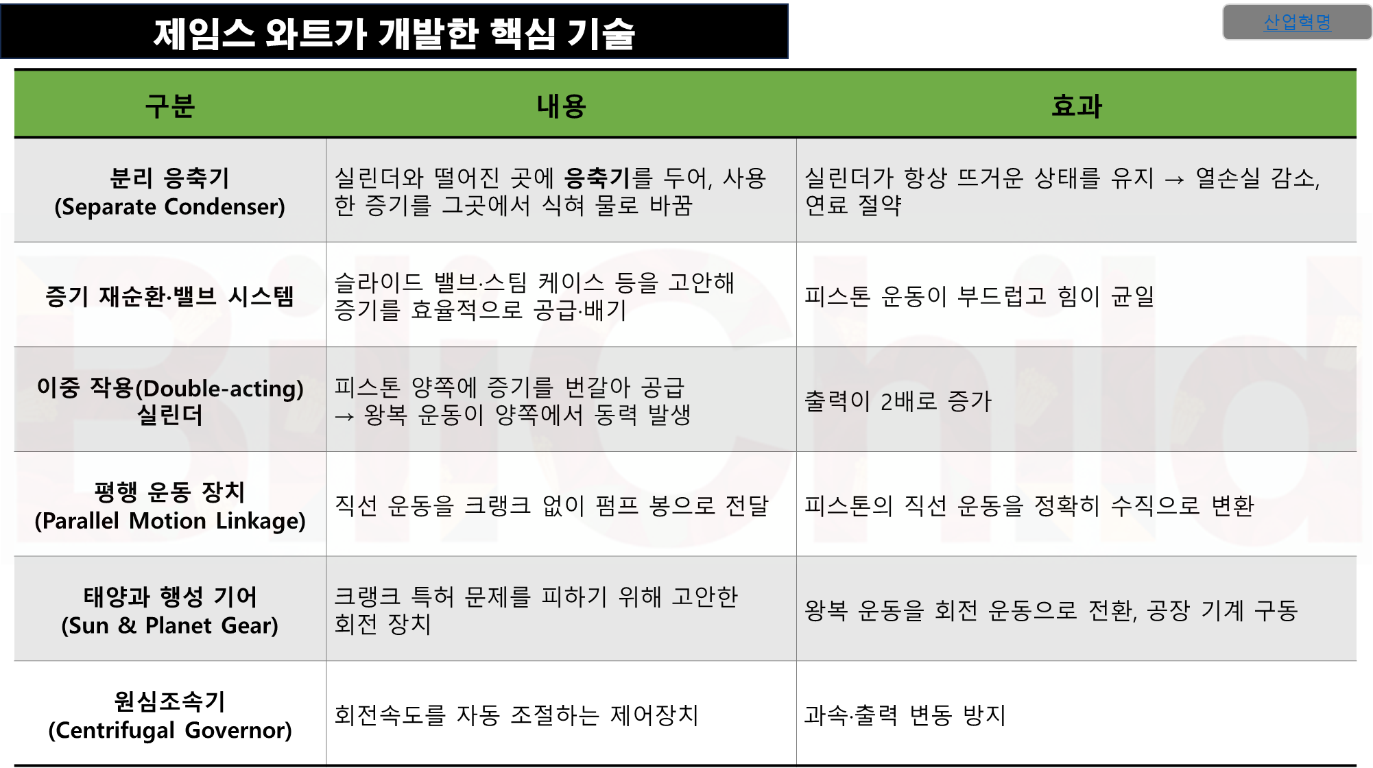 실린더와 떨어진 곳에 응축기를 두어, 사용한 증기를 그곳에서 식혀 물로 바꿈 | 실린더가 항상 뜨거운 상태를 유지 → 열손실 감소, 연료 절약 |