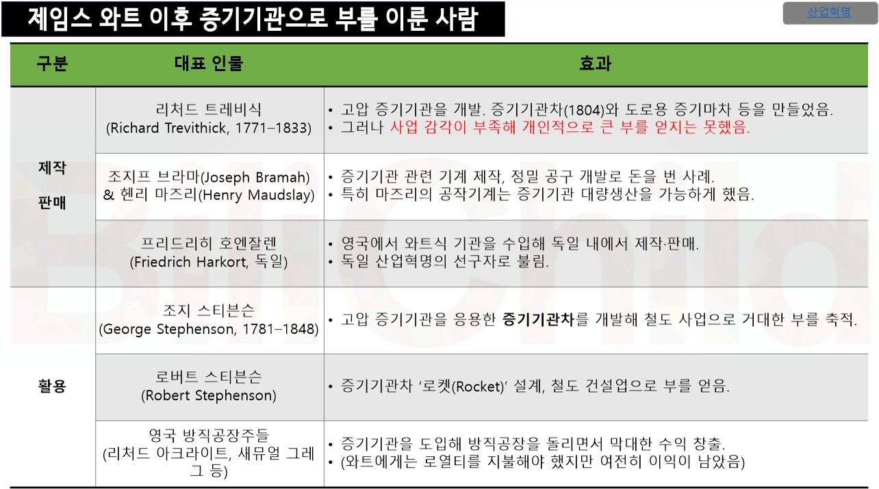 | 조지프 브라마(Joseph Bramah) & 헨리 마즈리(Henry Maudslay) | 증기기관 관련 기계 제작, 정밀 공구 개발로 돈을 번 사례. 특히 마즈리의 공작기계는 증기기관 대량생산을 가능하게 했음. |