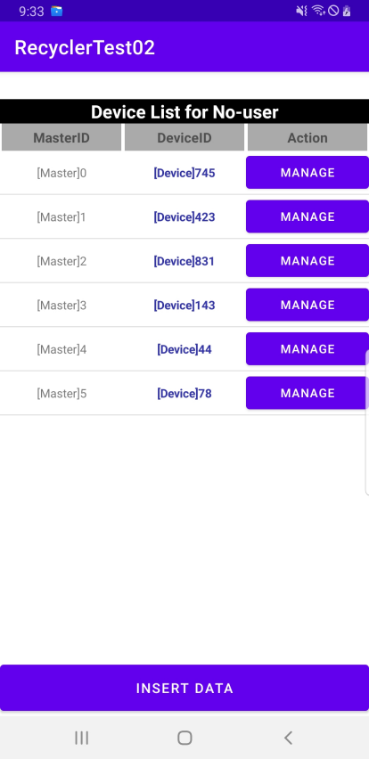 public class MainActivity extends AppCompatActivity { private ArrayList<cDeviceInfo> mDeviceList; private DeviceListAdapter mDeviceAdapter; private int count = -1; @Override protected void onCreate(Bundle savedInstanceState) { super.onCreate(savedInstanceState); setContentView(R.layout.activity_main); RecyclerView recyclerView = (RecyclerView) findViewById(R.id.recyclerview_device_list); LinearLayoutManager linearLayoutManager = new LinearLayoutManager(this); recyclerView.setLayoutManager(linearLayoutManager); mDeviceList = new ArrayList<>(); mDeviceAdapter = new DeviceListAdapter(mDeviceList, new DeviceListAdapter.OnItemClickListener() { @Override public void actionOnClick(View v, int position) { Log.d("[in Main-main]", mDeviceList.get(position).MasterID); } @Override public void subBtnClick(View v, int position){ Log.d("[in Main-sub]", mDeviceList.get(position).DeviceID ); } }); recyclerView.setAdapter(mDeviceAdapter); DividerItemDecoration dividerItemDecoration = new DividerItemDecoration(recyclerView.getContext(), linearLayoutManager.getOrientation()); recyclerView.addItemDecoration(dividerItemDecoration); Button insertButton = (Button) findViewById(R.id.btn_main_insert); insertButton.setOnClickListener(new View.OnClickListener(){ @Override public void onClick(View v) { count += 1; Random random1 = new Random(); cDeviceInfo deviceInfo1 = new cDeviceInfo(count, "[Master]"+(count), "[Device]"+(random1.nextInt(1000)), "UC"); Log.d("[Button-Click]", ""+mDeviceList.size()); mDeviceList.add(deviceInfo1); mDeviceAdapter.notifyDataSetChanged(); } }); } }