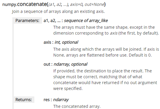 numpy.concatenate(array1, array2(, ...,), axis=0, out=None) : [Link]