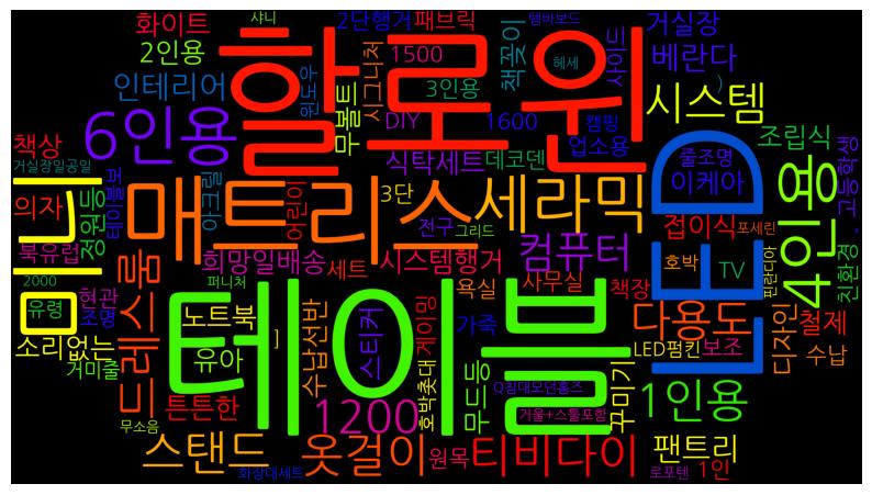 [('테이블', 9), ('할로윈', 8), ('LED', 7), ('매트리스', 6), ('미니', 6), ('세라믹', 5), ('6인용', 5), ('4인용', 5), ('티비다이', 4), ('1200', 4), ('1인용', 4), ('드레스룸', 4), ('스탠드', 4), ('옷걸이', 4), ('시스템', 4), ('다용도', 4), ('컴퓨터', 4), ('인테리어', 4), ('팬트리', 4), ('베란다', 4), ('소리없는', 3), ('식탁세트', 3), ('희망일배송', 3), ('화이트', 3), ('디자인', 3), ('2인용', 3), ('이케아', 3), ('시스템행거', 3), ('튼튼한', 3), ('조립식', 3), ('거실장', 3), ('접이식', 3), ('노트북', 3), ('책꽂이', 3), ('철제', 3), ('책상', 3), ('의자', 3), ('무볼트', 3), ('수납선반', 3), ('유아', 3), ('정원등', 3), ('무드등', 3), ('꾸미기', 3), ('스티커', 3), ('수납', 2), ('1500', 2), ('1600', 2), ('업소용', 2), ('가죽', 2), ('패브릭', 2), ('1인', 2), ('3인용', 2), ('북유럽', 2), ('시그니처', 2), (',', 2), ('2단행거', 2), ('사무실', 2), ('사이드', 2), ('TV', 2), ('보조', 2), ('게이밍', 2), ('고등학생', 2), ('원목', 2), ('아크릴', 2), ('3단', 2), ('책장', 2), ('어린이', 2), ('DIY', 2), ('세트', 2), ('욕실', 2), ('친환경', 2), ('현관', 2), ('데코덴', 2), ('거미줄', 2), ('줄조명', 2), ('조명', 2), ('전구', 2), ('유령', 2), ('윈도우', 2), (']', 2), ('테이블보', 2), (')', 2), ('호박촛대', 2), ('LED펌킨', 2), ('호박', 2), ('캠핑', 2), ('핀란디아', 1), ('Q침대모던홈즈', 1), ('퍼니처', 1), ('포세린', 1), ('샤니', 1), ('헤세', 1), ('템바보드', 1), ('화장대세트', 1), ('거울+스툴포함', 1), ('로포텐', 1), ('그리드', 1), ('2000', 1), ('거실장일공일', 1), ('무소음', 1)]