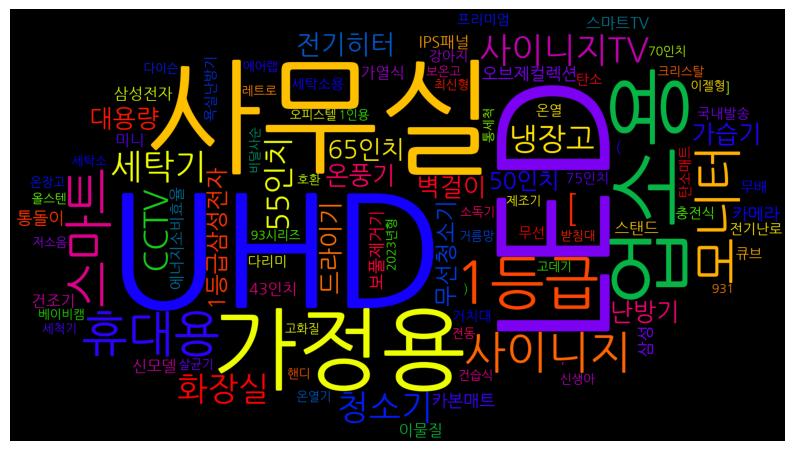 [('UHD', 27), ('LED', 26), ('사무실', 25), ('가정용', 20), ('업소용', 18), ('1등급', 17), ('모니터', 12), ('스마트', 12), ('휴대용', 12), ('사이니지', 11), ('사이니지TV', 10), ('청소기', 10), ('세탁기', 10), ('[', 10), ('화장실', 9), ('CCTV', 9), ('55인치', 8), ('냉장고', 8), ('전기히터', 8), ('65인치', 7), ('벽걸이', 7), ('대용량', 7), ('온풍기', 7), ('가습기', 7), ('난방기', 7), ('드라이기', 7), ('1등급삼성전자', 6), ('50인치', 6), ('무선청소기', 6), ('오브제컬렉션', 6), ('카본매트', 6), ('통돌이', 6), ('삼성', 6), ('보풀제거기', 6), ('카메라', 6), ('삼성전자', 5), ('43인치', 5), ('IPS패널', 5), ('스마트TV', 5), ('에너지소비효율', 5), ('신모델', 5), ('스탠드', 5), ('가열식', 5), ('건조기', 5), ('이물질', 5), ('(', 5), ('미니', 5), ('75인치', 4), ('프리미엄', 4), ('욕실난방기', 4), ('큐브', 4), ('전기난로', 4), ('탄소매트', 4), ('국내발송', 4), ('무배', 4), ('온열', 4), ('거치대', 4), ('충전식', 4), (',', 4), ('다리미', 4), ('세탁소용', 4), ('무선', 4), ('강아지', 4), (']', 4), ('탄소', 4), ('크리스탈', 3), ('70인치', 3), ('건습식', 3), ('2023년형', 3), ('세척기', 3), ('저소음', 3), ('핸디', 3), ('오피스텔', 3), ('온장고', 3), ('보온고', 3), ('신생아', 3), ('올스텐', 3), ('통세척', 3), ('1인용', 3), ('93시리즈', 3), ('931', 3), ('온열기', 3), ('거름망', 3), ('호환', 3), ('제조기', 3), ('레트로', 3), ('다이슨', 3), ('에어랩', 3), ('고데기', 3), ('비달사순', 3), ('전동', 3), ('소독기', 3), ('살균기', 3), (')', 3), ('받침대', 3), ('이젤형', 3), ('세탁소', 3), ('최신형', 3), ('베이비캠', 3), ('고화질', 3)]
