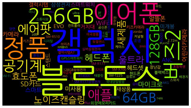 [('갤럭시', 15), ('블루투스', 12), ('이어폰', 9), ('정품', 9), ('256GB', 7), ('버즈2', 7), ('공기계', 7), ('64GB', 6), ('128GB', 6), ('애플', 6), ('에어팟', 5), ('노이즈캔슬링', 5), ('헤드폰', 5), ('울트라', 5), ('효도폰', 5), ('새제품', 5), ('마이크로', 5), ('SD카드', 5), ('WiFi', 4), ('헤드셋', 4), ('스마트', 4), ('미사용', 4), ('알뜰폰', 4), ('카메라', 4), ('어린이카메라', 4), ('삼성전자', 3), ('미개봉', 3), ('갤럭시탭', 3), ('거치대', 3), ('스탠드', 3), ('새상품', 3), ('ANC', 3), ('스마트워치', 3), ('EVO', 3), ('외장메모리카드', 3), ('핸드폰', 3), ('블랙박스', 3), ('조명', 3), ('키즈카메라', 3), ('장난감', 3), ('갤럭시탭A7', 2), ('SM-T225', 2), ('LTE', 2), ('태블릿', 2), ('SM-X700', 2), ('128GB삼성전자', 2), ('Wi-Fi', 2), ('국내당일발송', 2), ('실버삼성전자', 2), ('커널형', 2), ('SM-R177삼성전자', 2), ('SM-R177', 2), ('우드', 2), ('SM-R510', 2), ('AKG', 2), ('N5005', 2), ('미국정품', 2), ('브리츠', 2), ('BT4000', 2), ('zordai', 2), ('zd8', 2), ('ultra', 2), ('GPS스마트워치', 2), ('케이스', 2), ('어린이', 2), ('초등학생', 2), ('(', 2), ('무선', 2), ('컨트롤러', 2), ('듀얼센스', 2), ('스위치', 2), ('키즈폰', 2), ('플립3', 2), ('자급제', 2), ('무약정', 2), ('공신폰', 2), ('32GB', 2), ('Plus', 2), ('microSD', 2), ('양면', 2), ('2.72m', 2), ('스튜디오', 2), ('배경지', 2), ('[', 2), (']', 2), ('디지털', 2), ('미니', 2), ('유아', 2), ('유튜브', 2), ('Lite', 1), ('새제품MS', 1), ('서피스', 1), ('프로5', 1), ('1796', 1), ('코어i5', 1), ('7세대', 1), ('NVMe', 1), ('윈10프로해외ALLDOCUBE', 1), ('IPLAY50', 1), ('PRO', 1)]