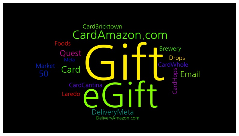 [('Gift', 12), ('eGift', 10), ('CardAmazon.com', 9), ('Card', 5), ('Quest', 4), ('50', 4), ('Email', 4), ('DeliveryMeta', 3), ('CardHops', 2), ('Drops', 2), ('CardCantina', 2), ('Laredo', 2), ('CardBricktown', 2), ('Brewery', 2), ('CardWhole', 2), ('Foods', 2), ('Market', 2), ('Meta', 1), ('DeliveryAmazon.com', 1)]