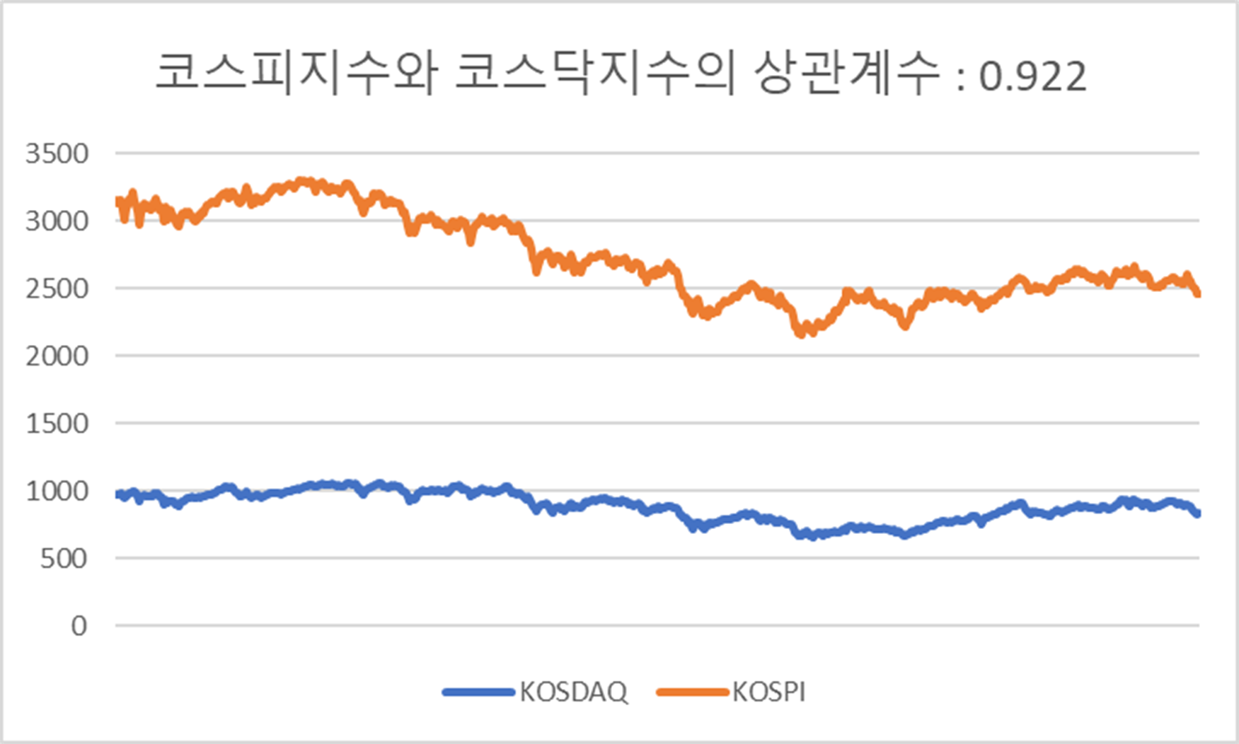 아래에 최근 3년 동안의 코스피 지수와 코스닥 지수의 상관 관계를 분석한 예시를 보여준다.