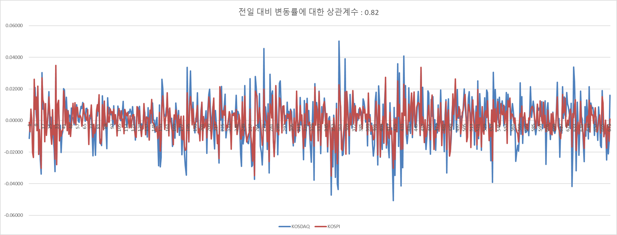 양 지수의 변동률이 약간의 차이가 났음을 의미하지만, 0.8이상인 점을 감안하면 거의 동일하게 변동한다는 것을 알 수 있다.