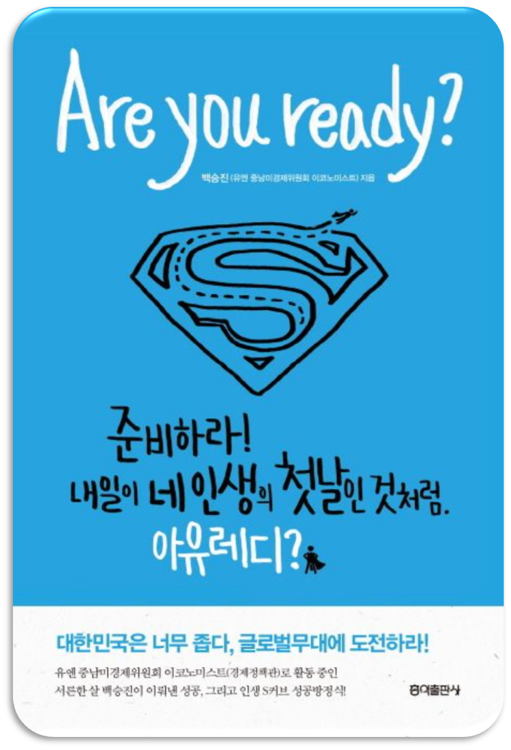 [책 소개] 『아 유 레디(Are you ready)』는 미국 선물거래사, 미국 공인회계사 시험에 이어 유엔 국제고시에 연거푸 합격한 저자 백승진의 공부 노하우와 성공 체험담을 바탕으로 대한민국 젊은이들에게 글로벌무대로의 진출을 권유하는 씨줄로, 저자가 세계무대에서 만난 성공자들의 성공 요인을 흥미진진한 에피소드와 함께 소개한 책이다. '인생 S커브 성공방정식', '티핑포인트 법칙' 등 저자가 현재를 만들어낸 성공법칙들을 알려준다. |
