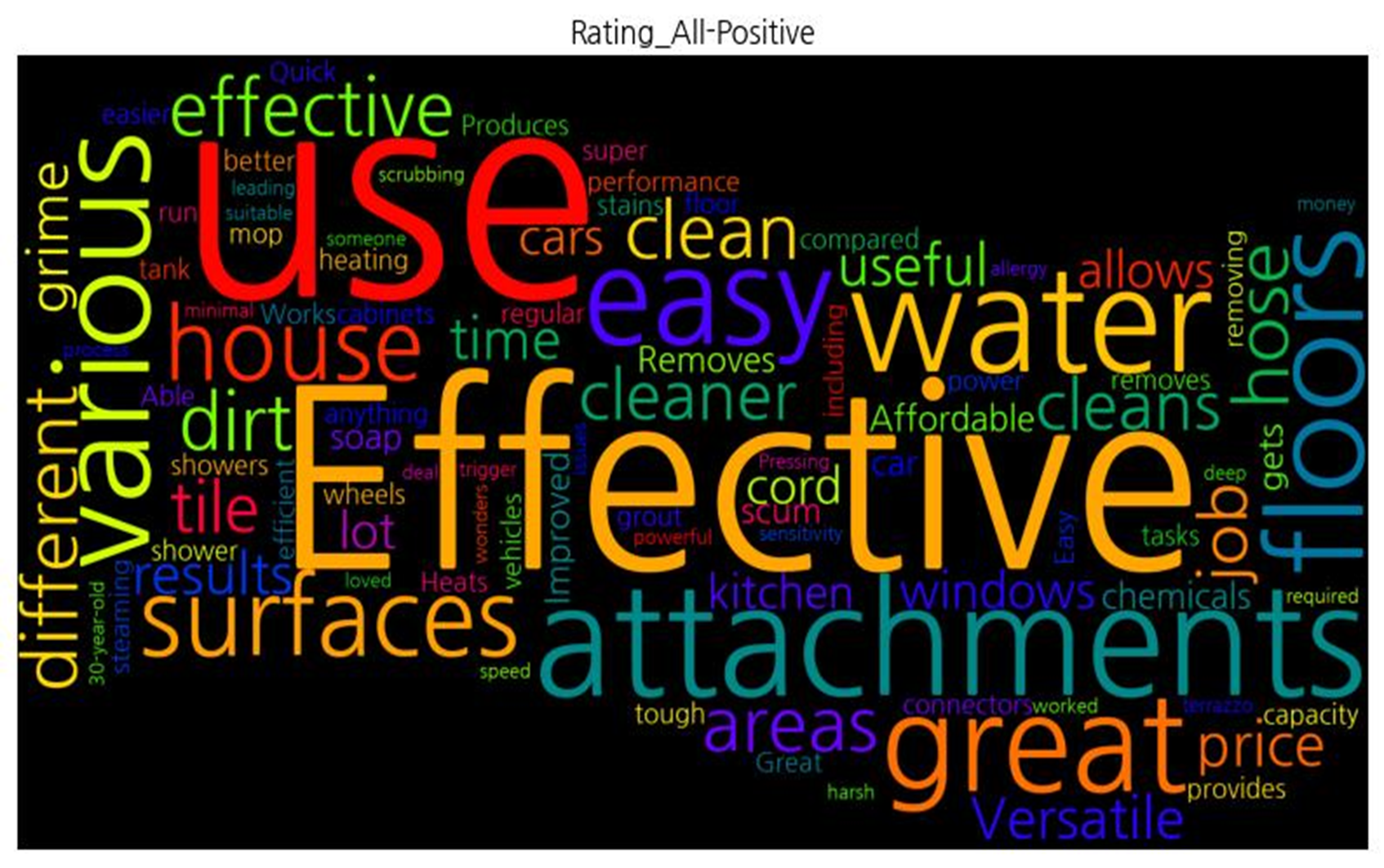 | [('use', 15), ('Effective', 11), ('attachments', 8), ('water', 7), ('great', 6), ('various', 6), ('floors', 6), ('easy', 6), ('surfaces', 6), ('house', 5), ('effective', 5), ('dirt', 5), ('clean', 5), ('hose', 5), ('areas', 5), ('different', 5), ('job', 4), ('cleaner', 4), ('cleans', 4), ('tile', 4), ('price', 3), ('Versatile', 3), ('useful', 3), ('results', 3), ('time', 3), ('grime', 3), ('windows', 3), ('lot', 3), ('allows', 3), ('cord', 3), ('cars', 3), ('kitchen', 3), ('Affordable', 2), ('gets', 2), ('Removes', 2), ('soap', 2), ('scum', 2), ('chemicals', 2), ('car', 2), ('Improved', 2), ('performance', 2), ('compared', 2), ('tasks', 2), ('heating', 2), ('floor', 2), ('super', 2), ('run', 2), ('anything', 2), ('Great', 2), ('Produces', 2), ('easier', 2), ('better', 2), ('capacity', 2), ('removing', 2), ('Quick', 2), ('efficient', 2), ('regular', 2), ('mop', 2), ('tank', 2), ('power', 2), ('provides', 2), ('Heats', 2), ('Works', 2), ('wheels', 2), ('shower', 2), ('including', 2), ('vehicles', 2), ('steaming', 2), ('connectors', 2), ('showers', 2), ('Able', 2), ('cabinets', 2), ('tough', 2), ('removes', 2), ('stains', 2), ('Easy', 2), ('grout', 2), ('powerful', 1), ('someone', 1), ('allergy', 1), ('issues', 1), ('sensitivity', 1), ('harsh', 1), ('minimal', 1), ('scrubbing', 1), ('required', 1), ('deep', 1), ('suitable', 1), ('deal', 1), ('money', 1), ('worked', 1), ('wonders', 1), ('loved', 1), ('30-year-old', 1), ('terrazzo', 1), ('Pressing', 1), ('trigger', 1), ('speed', 1), ('process', 1), ('leading', 1)] | |