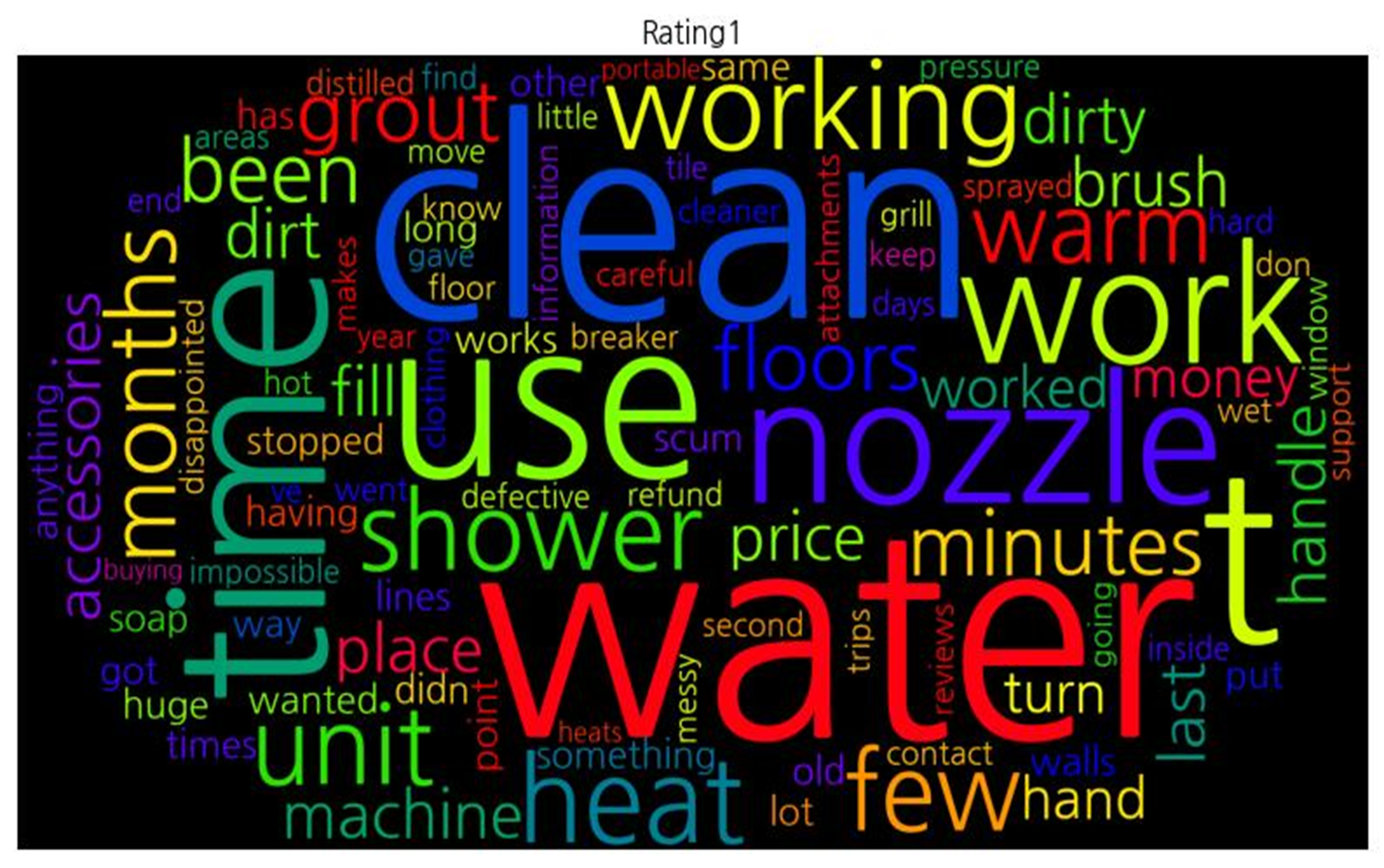 | [('water', 18), ('clean', 16), ('t', 12), ('time', 10), ('use', 10), ('nozzle', 6), ('work', 6), ('working', 6), ('heat', 6), ('unit', 5), ('few', 5), ('shower', 5), ('warm', 4), ('months', 4), ('minutes', 4), ('been', 4), ('grout', 4), ('floors', 4), ('machine', 4), ('last', 4), ('dirty', 4), ('handle', 4), ('place', 4), ('dirt', 4), ('brush', 4), ('accessories', 4), ('price', 4), ('fill', 4), ('hand', 3), ('worked', 3), ('money', 3), ('turn', 3), ('something', 3), ('stopped', 3), ('has', 3), ('got', 3), ('same', 3), ('times', 3), ('old', 3), ('lines', 3), ('walls', 3), ('soap', 3), ('scum', 3), ('having', 3), ('lot', 3), ('works', 3), ('other', 3), ('anything', 3), ('long', 3), ('wanted', 3), ('way', 3), ('didn', 3), ('put', 3), ('point', 3), ('huge', 3), ('hot', 2), ('impossible', 2), ('find', 2), ('refund', 2), ('defective', 2), ('contact', 2), ('makes', 2), ('disappointed', 2), ('trips', 2), ('breaker', 2), ('careful', 2), ('distilled', 2), ('support', 2), ('gave', 2), ('information', 2), ('days', 2), ('going', 2), ('year', 2), ('tile', 2), ('grill', 2), ('sprayed', 2), ('cleaner', 2), ('little', 2), ('pressure', 2), ('second', 2), ('attachments', 2), ('went', 2), ('floor', 2), ('reviews', 2), ('end', 2), ('clothing', 2), ('ve', 2), ('don', 2), ('know', 2), ('inside', 2), ('messy', 2), ('wet', 2), ('window', 2), ('areas', 2), ('move', 2), ('hard', 2), ('keep', 2), ('portable', 2), ('buying', 2), ('heats', 2)] |