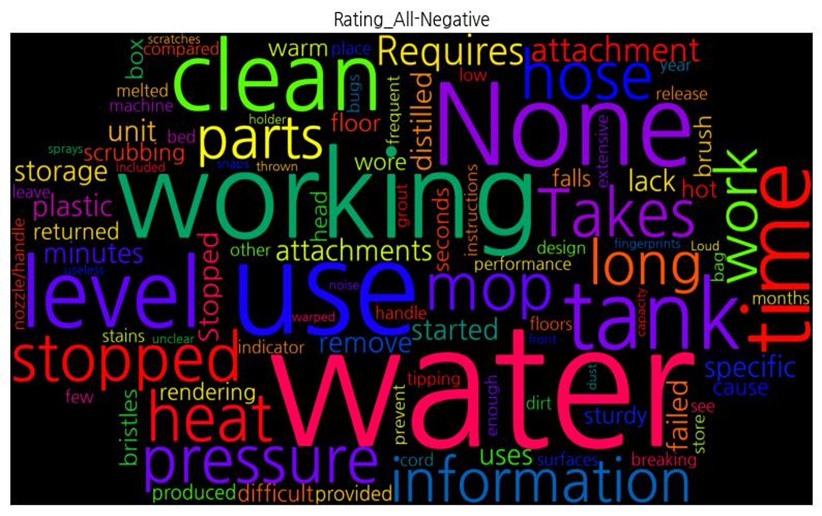 | [('water', 23), ('use', 12), ('working', 10), ('None', 9), ('tank', 6), ('level', 6), ('time', 6), ('clean', 6), ('stopped', 5), ('Takes', 5), ('heat', 5), ('mop', 5), ('pressure', 5), ('hose', 5), ('parts', 4), ('long', 4), ('work', 4), ('information', 4), ('Requires', 4), ('attachment', 4), ('plastic', 3), ('attachments', 3), ('unit', 3), ('Stopped', 3), ('uses', 3), ('remove', 3), ('minutes', 3), ('storage', 3), ('failed', 3), ('started', 3), ('lack', 3), ('distilled', 3), ('specific', 3), ('brush', 2), ('bristles', 2), ('floor', 2), ('box', 2), ('hot', 2), ('warm', 2), ('scrubbing', 2), ('sturdy', 2), ('wore', 2), ('rendering', 2), ('difficult', 2), ('falls', 2), ('cause', 2), ('seconds', 2), ('returned', 2), ('head', 2), ('produced', 2), ('provided', 2), ('performance', 2), ('machine', 2), ('stains', 2), ('indicator', 2), ('dirt', 2), ('see', 2), ('low', 2), ('surfaces', 2), ('compared', 2), ('other', 2), ('bag', 2), ('grout', 2), ('few', 2), ('release', 2), ('breaking', 2), ('design', 2), ('tipping', 2), ('melted', 2), ('months', 2), ('nozzle/handle', 2), ('frequent', 2), ('instructions', 2), ('place', 2), ('cord', 2), ('leave', 2), ('enough', 2), ('year', 2), ('handle', 2), ('store', 2), ('prevent', 2), ('bed', 2), ('bugs', 2), ('floors', 2), ('extensive', 2), ('warped', 1), ('front', 1), ('holder', 1), ('snaps', 1), ('included', 1), ('fingerprints', 1), ('dust', 1), ('scratches', 1), ('thrown', 1), ('Loud', 1), ('noise', 1), ('unclear', 1), ('capacity', 1), ('sprays', 1), ('useless', 1)] | |