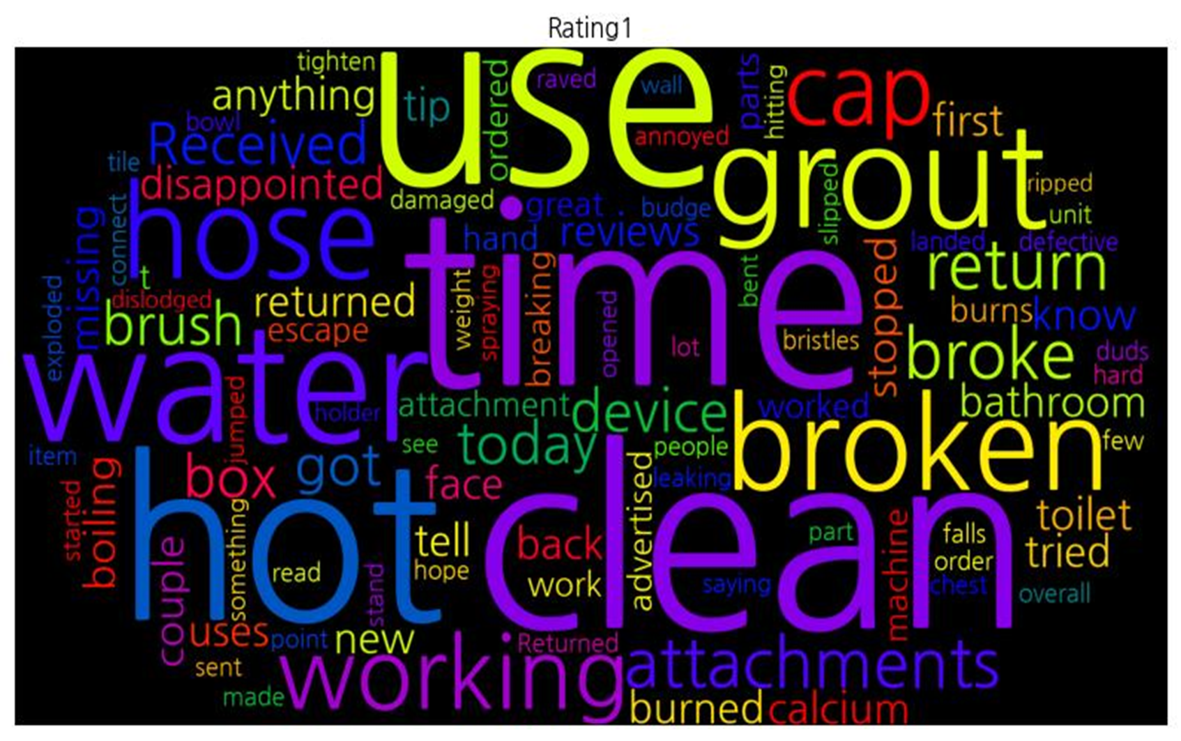 | [('use', 5), ('clean', 5), ('time', 5), ('hot', 4), ('water', 4), ('grout', 3), ('broken', 3), ('hose', 3), ('working', 3), ('cap', 3), ('attachments', 3), ('broke', 3), ('return', 3), ('Received', 2), ('today', 2), ('box', 2), ('brush', 2), ('device', 2), ('got', 2), ('disappointed', 2), ('reviews', 2), ('know', 2), ('returned', 2), ('anything', 2), ('stopped', 2), ('uses', 2), ('first', 2), ('tried', 2), ('boiling', 2), ('face', 2), ('bathroom', 2), ('toilet', 2), ('burned', 2), ('back', 2), ('new', 2), ('tell', 2), ('missing', 2), ('calcium', 2), ('tip', 2), ('couple', 2), ('attachment', 2), ('escape', 2), ('burns', 2), ('hand', 2), ('advertised', 2), ('work', 2), ('worked', 2), ('great', 2), ('ordered', 2), ('parts', 2), ('machine', 2), ('t', 2), ('breaking', 2), ('order', 1), ('opened', 1), ('see', 1), ('bristles', 1), ('damaged', 1), ('bent', 1), ('hope', 1), ('sent', 1), ('defective', 1), ('part', 1), ('annoyed', 1), ('item', 1), ('hard', 1), ('connect', 1), ('stand', 1), ('falls', 1), ('read', 1), ('saying', 1), ('overall', 1), ('people', 1), ('raved', 1), ('few', 1), ('duds', 1), ('unit', 1), ('made', 1), ('lot', 1), ('point', 1), ('something', 1), ('budge', 1), ('Returned', 1), ('started', 1), ('leaking', 1), ('tighten', 1), ('exploded', 1), ('spraying', 1), ('jumped', 1), ('slipped', 1), ('tile', 1), ('landed', 1), ('chest', 1), ('weight', 1), ('hitting', 1), ('bowl', 1), ('dislodged', 1), ('holder', 1), ('ripped', 1), ('wall', 1)] |