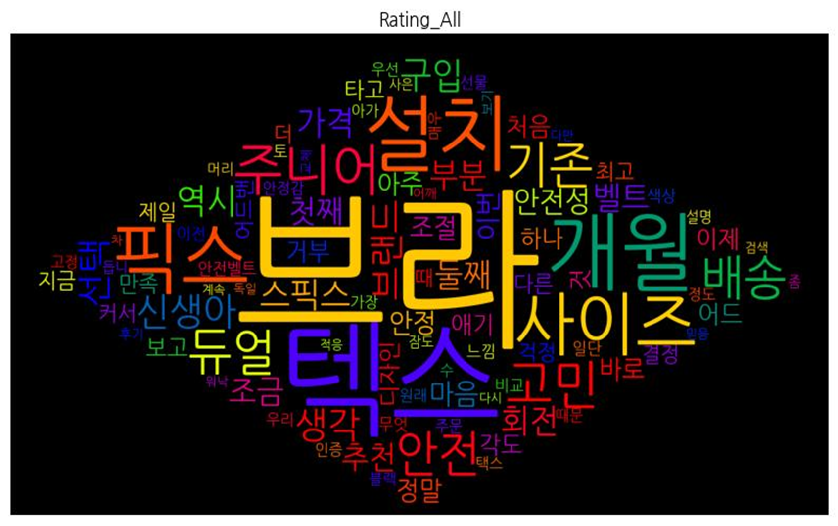 | 평점 전체 | ![]() [('브라', 800), ('텍스', 755), ('개월', 271), ('설치', 256), ('픽스', 221), ('사이즈', 214), ('주니어', 205), ('고민', 184), ('기존', 166), ('듀얼', 163), ('안전', 153), ('배송', 153), ('신생아', 142), ('생각', 134), ('선택', 133), ('브랜드', 128), ('구입', 125), ('역시', 118), ('스픽스', 116), ('회전', 104), ('가격', 103), ('부분', 100), ('둘째', 100), ('벨트', 98), ('첫째', 96), ('조금', 95), ('추천', 93), ('안전성', 93), ('마음', 88), ('안정', 81), ('조절', 80), ('이번', 80), ('정말', 76), ('아주', 76), ('바로', 76), ('어드', 72), ('처음', 71), ('거부', 69), ('이제', 68), ('애기', 66), ('각도', 65), ('하나', 65), ('것', 65), ('보고', 63), ('디자인', 60), ('타고', 58), ('만족', 56), ('다른', 56), ('최고', 54), ('더', 52), ('제일', 51), ('지금', 50), ('커서', 49), ('어드밴', 49), ('걱정', 49), ('결정', 48), ('때', 48), ('안전벨트', 47), ('일단', 47), ('토', 47), ('비교', 46), ('느낌', 45), ('무엇', 45), ('색상', 45), ('이전', 44), ('우리', 40), ('고정', 40), ('아가', 40), ('우선', 39), ('가장', 39), ('때문', 39), ('블랙', 39), ('안정감', 38), ('수', 37), ('정도', 36), ('매우', 36), ('주문', 36), ('택스', 36), ('인증', 35), ('원래', 35), ('선물', 35), ('머리', 34), ('설명', 33), ('좀', 33), ('잠도', 32), ('듭니', 32), ('후기', 31), ('보기', 31), ('교체', 30), ('어깨', 30), ('사은', 30), ('워낙', 29), ('독일', 29), ('믿음', 29), ('다시', 29), ('검색', 29), ('적응', 29), ('계속', 29), ('다만', 29), ('차', 29)] |