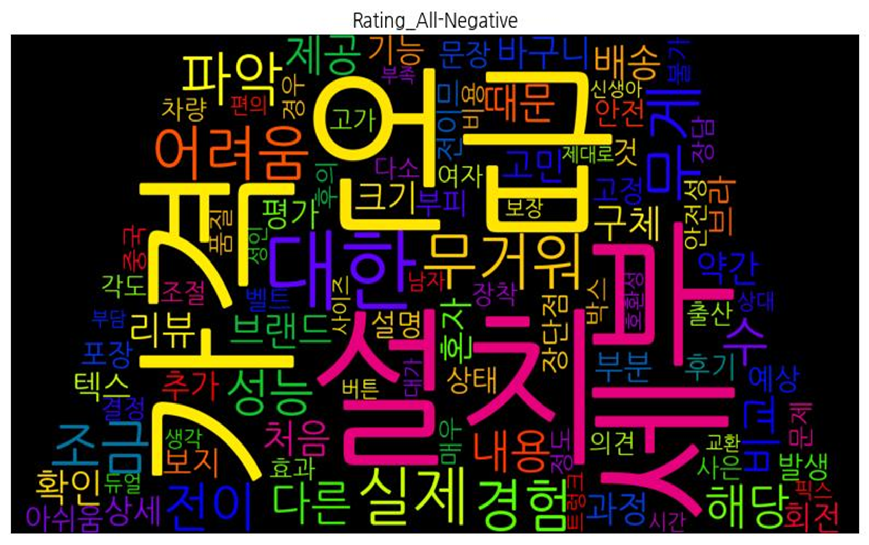 | 부정 속성 | ![]() [('언급', 53), ('가격', 52), ('설치', 47), ('세부', 44), ('대한', 43), ('무게', 19), ('실제', 19), ('무거워', 18), ('어려움', 17), ('파악', 16), ('조금', 15), ('경험', 15), ('전이', 13), ('수', 13), ('성능', 12), ('해당', 11), ('다른', 10), ('내용', 10), ('비교', 9), ('제공', 9), ('때문', 8), ('처음', 7), ('배송', 7), ('확인', 7), ('리뷰', 7), ('브랜드', 7), ('구체', 7), ('약간', 6), ('과정', 6), ('바구니', 6), ('혼자', 6), ('크기', 6), ('고민', 6), ('회전', 5), ('브라', 5), ('텍스', 5), ('부분', 5), ('상세', 5), ('기능', 5), ('보지', 5), ('평가', 5), ('추가', 5), ('고정', 4), ('발생', 4), ('상태', 4), ('아쉬움', 4), ('예상', 4), ('부피', 4), ('문장', 4), ('설명', 4), ('안전', 4), ('포장', 4), ('전이므', 4), ('장단점', 4), ('것', 4), ('후기', 4), ('차량', 3), ('의견', 3), ('각도', 3), ('조절', 3), ('사은', 3), ('벨트', 3), ('효과', 3), ('박스', 3), ('안전성', 3), ('장착', 3), ('여자', 3), ('출산', 3), ('고가', 3), ('결정', 3), ('다소', 3), ('매우', 3), ('문제', 3), ('중국', 3), ('경우', 3), ('품질', 3), ('정도', 3), ('불가', 3), ('후의', 3), ('비용', 3), ('장담', 3), ('버튼', 2), ('호환성', 2), ('상대', 2), ('생각', 2), ('시간', 2), ('대가', 2), ('편의', 2), ('보장', 2), ('성인', 2), ('남자', 2), ('트렁크', 2), ('듀얼', 2), ('픽스', 2), ('사이즈', 2), ('신생아', 2), ('부담', 2), ('교환', 2), ('부족', 2), ('제대로', 2)] |