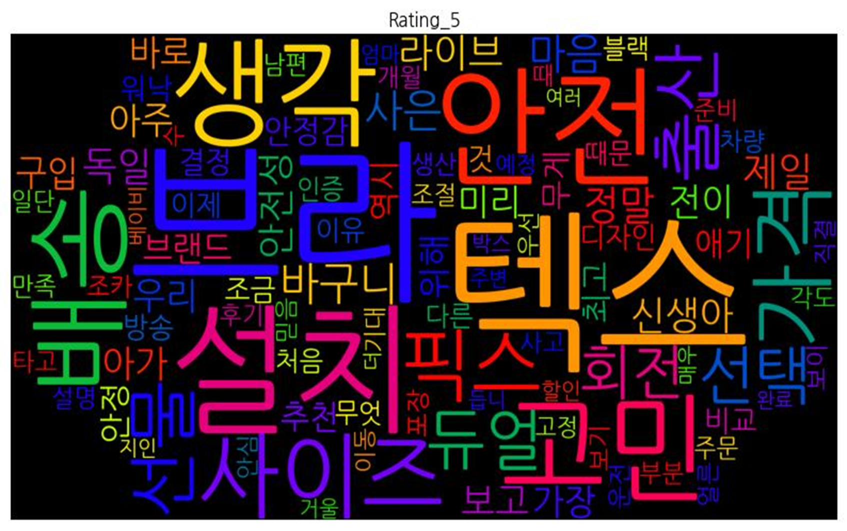 | 평점 5점 | ![]() [('브라', 285), ('텍스', 281), ('설치', 169), ('안전', 144), ('고민', 118), ('생각', 118), ('배송', 104), ('사이즈', 102), ('가격', 96), ('픽스', 90), ('출산', 79), ('선물', 78), ('듀얼', 77), ('선택', 72), ('회전', 71), ('바구니', 68), ('사은', 66), ('마음', 61), ('정말', 56), ('제일', 53), ('라이브', 53), ('독일', 52), ('신생아', 51), ('안전성', 51), ('보고', 50), ('아가', 48), ('우리', 47), ('전이', 47), ('아주', 46), ('미리', 45), ('가장', 45), ('바로', 44), ('구입', 44), ('위해', 42), ('브랜드', 40), ('안정', 38), ('최고', 38), ('역시', 38), ('애기', 38), ('추천', 38), ('무게', 36), ('안정감', 36), ('결정', 31), ('비교', 31), ('것', 31), ('워낙', 30), ('조금', 29), ('이제', 29), ('디자인', 29), ('방송', 29), ('이유', 27), ('때문', 25), ('처음', 25), ('다른', 25), ('무엇', 24), ('인증', 24), ('블랙', 23), ('포장', 22), ('차량', 22), ('생산', 22), ('조카', 22), ('설명', 21), ('각도', 21), ('조절', 21), ('만족', 21), ('개월', 21), ('타고', 21), ('사고', 21), ('남편', 20), ('부분', 20), ('주문', 20), ('준비', 20), ('후기', 20), ('직결', 20), ('보기', 20), ('기대', 20), ('보이', 20), ('운전', 19), ('일단', 19), ('믿음', 19), ('수', 19), ('때', 19), ('우선', 18), ('고정', 18), ('이동', 18), ('얼른', 18), ('안심', 18), ('예정', 17), ('박스', 16), ('거울', 16), ('엄마', 16), ('할인', 16), ('베이비', 15), ('지인', 15), ('주변', 15), ('매우', 15), ('듭니', 15), ('더', 15), ('완료', 14), ('여러', 14)] |