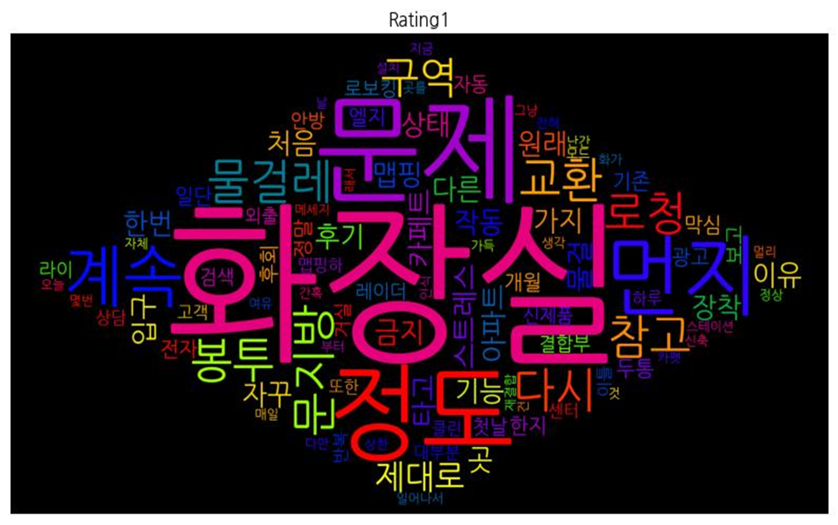 | 평점 1점 | ![]() [('화장실', 7), ('문제', 5), ('정도', 4), ('먼지', 4), ('계속', 4), ('물걸레', 3), ('교환', 3), ('문지방', 3), ('다시', 3), ('봉투', 3), ('참고', 3), ('로청', 3), ('구역', 3), ('제대로', 3), ('후기', 2), ('스트레스', 2), ('기능', 2), ('장착', 2), ('처음', 2), ('입구', 2), ('한번', 2), ('맵핑', 2), ('작동', 2), ('아파트', 2), ('이유', 2), ('가지', 2), ('자꾸', 2), ('카페트', 2), ('원래', 2), ('금지', 2), ('타고', 2), ('다른', 2), ('상태', 2), ('물걸', 2), ('곳', 2), ('한지', 1), ('개월', 1), ('광고', 1), ('보고', 1), ('정말', 1), ('후회', 1), ('막심', 1), ('두통', 1), ('일단', 1), ('기존', 1), ('엘지', 1), ('전자', 1), ('로보킹', 1), ('자동', 1), ('검색', 1), ('첫날', 1), ('결합부', 1), ('안방', 1), ('거실', 1), ('라이', 1), ('레이더', 1), ('신제품', 1), ('외출', 1), ('대부분', 1), ('고객', 1), ('센터', 1), ('상담', 1), ('반복', 1), ('맵핑하', 1), ('하루', 1), ('이틀', 1), ('또한', 1), ('클린', 1), ('스테이션', 1), ('여유', 1), ('몇번', 1), ('재결합', 1), ('정상', 1), ('일어나서', 1), ('매일', 1), ('신축', 1), ('자체', 1), ('난간', 1), ('화가', 1), ('생각', 1), ('건', 1), ('부터', 1), ('가득', 1), ('래서', 1), ('지금', 1), ('카펫', 1), ('모드', 1), ('전혀', 1), ('간혹', 1), ('상한', 1), ('오늘', 1), ('설치', 1), ('곳를', 1), ('메세지', 1), ('인식', 1), ('멀리', 1), ('날', 1), ('그냥', 1), ('것', 1), ('다만', 1)] |
