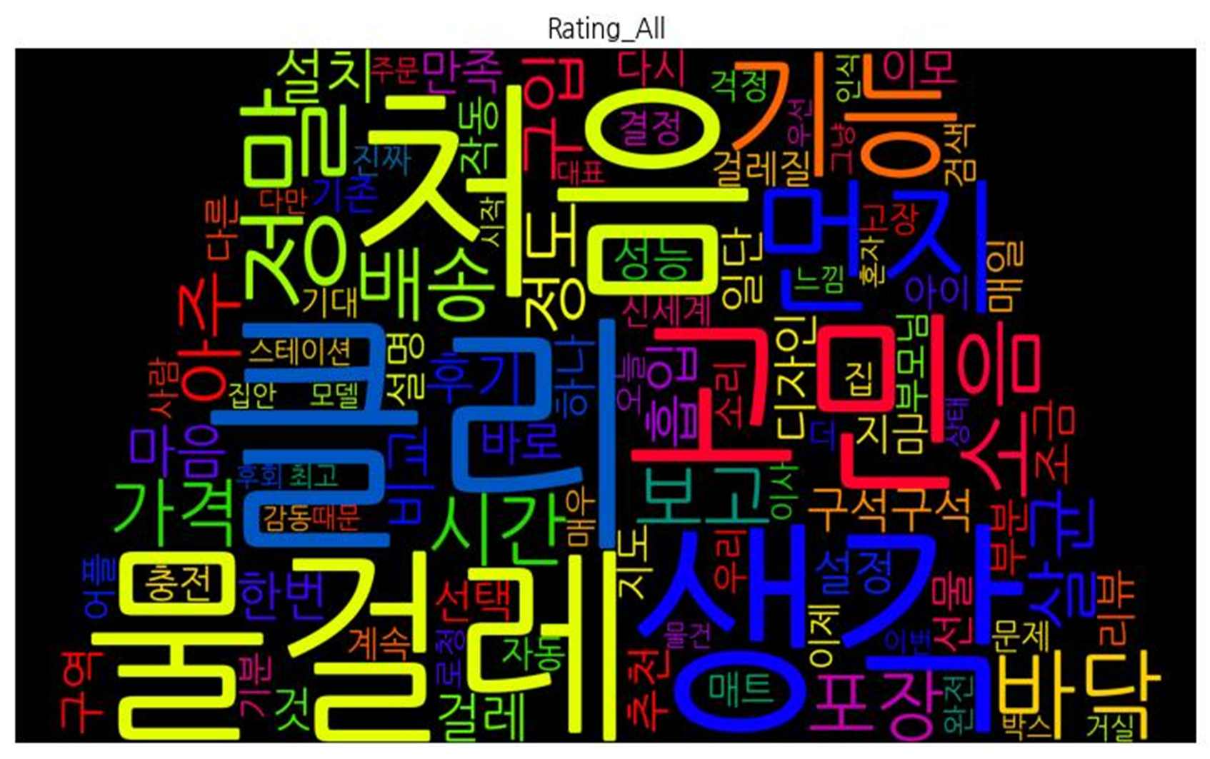 | 평점 전체 | ![]() [('클리', 380), ('처음', 320), ('생각', 308), ('물걸레', 302), ('고민', 261), ('먼지', 246), ('기능', 244), ('정말', 192), ('바닥', 185), ('소음', 184), ('배송', 179), ('시간', 176), ('포장', 164), ('보고', 163), ('살균', 162), ('가격', 149), ('아주', 145), ('정도', 143), ('구입', 138), ('설치', 130), ('흡입', 127), ('마음', 127), ('후기', 125), ('비교', 122), ('걸레', 122), ('한번', 117), ('구석구석', 116), ('설정', 116), ('만족', 116), ('구역', 115), ('바로', 114), ('디자인', 114), ('추천', 111), ('일단', 107), ('하나', 106), ('조금', 105), ('것', 104), ('성능', 102), ('선택', 99), ('선물', 99), ('이모', 93), ('작동', 93), ('리뷰', 91), ('설명', 90), ('지금', 87), ('부분', 85), ('지도', 85), ('매일', 85), ('다시', 82), ('걸레질', 82), ('기존', 82), ('충전', 82), ('아이', 81), ('매트', 79), ('결정', 76), ('소리', 76), ('자동', 74), ('계속', 74), ('기분', 74), ('이제', 73), ('다른', 72), ('우리', 71), ('부모님', 71), ('어플', 70), ('검색', 69), ('집', 69), ('신세계', 68), ('걱정', 68), ('고장', 67), ('진짜', 67), ('더', 67), ('문제', 65), ('로청', 65), ('오늘', 65), ('매우', 64), ('사람', 63), ('완전', 63), ('기대', 62), ('이사', 60), ('스테이션', 59), ('느낌', 58), ('박스', 58), ('거실', 56), ('때문', 53), ('주문', 53), ('집안', 52), ('모델', 52), ('다만', 51), ('후회', 50), ('대표', 49), ('물건', 49), ('최고', 49), ('감동', 49), ('상태', 49), ('그냥', 48), ('혼자', 48), ('인식', 48), ('이번', 47), ('시작', 46), ('우선', 44)] |