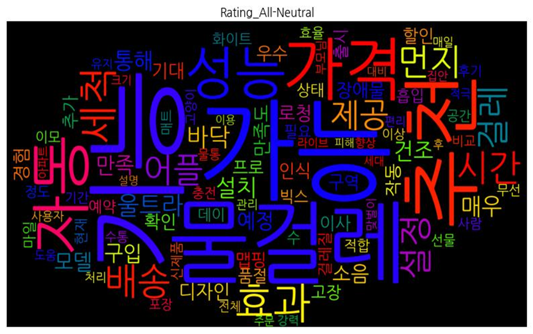 | 긍정 속성 | ![]() [('기능', 557), ('물걸레', 367), ('자동', 290), ('가능', 284), ('효과', 216), ('배송', 203), ('성능', 183), ('세척', 174), ('먼지', 145), ('바닥', 141), ('건조', 120), ('디자인', 119), ('걸레', 113), ('흡입', 113), ('장애물', 111), ('소음', 109), ('맵핑', 104), ('설치', 104), ('인식', 102), ('걸레질', 94), ('가격', 85), ('능력', 83), ('매우', 81), ('설정', 76), ('작동', 72), ('포장', 69), ('울트라', 68), ('효율', 68), ('어플', 65), ('우수', 63), ('제공', 59), ('시간', 58), ('크기', 56), ('구석구석', 53), ('회피', 47), ('화이트', 47), ('매핑', 46), ('피해', 45), ('구역', 43), ('박스', 41), ('처리', 41), ('집안', 38), ('수', 36), ('로청', 35), ('유지', 35), ('지도', 34), ('상태', 33), ('할인', 33), ('색상', 32), ('프로', 32), ('공간', 32), ('통해', 31), ('카펫', 31), ('열풍', 30), ('사물', 29), ('머리카락', 29), ('예약', 28), ('만족', 27), ('편리', 27), ('매트', 27), ('충전', 26), ('도착', 26), ('만족도', 26), ('이모', 25), ('매일', 25), ('연동', 25), ('물', 25), ('확인', 24), ('진공', 24), ('모델', 24), ('어울림', 24), ('모드', 23), ('설명', 22), ('물통', 22), ('속도', 22), ('편의', 21), ('도크', 21), ('인테리어', 21), ('가지', 21), ('물걸', 21), ('비우기', 21), ('물건', 21), ('진행', 20), ('이상', 19), ('연결', 19), ('결과', 19), ('관리', 19), ('스마트', 19), ('통한', 19), ('쉬움', 19), ('카페트', 19), ('추천', 19), ('앱', 19), ('스캔', 18), ('기대', 18), ('고양이', 18), ('센서', 18), ('무게', 18), ('금지', 18), ('절약', 18)] |