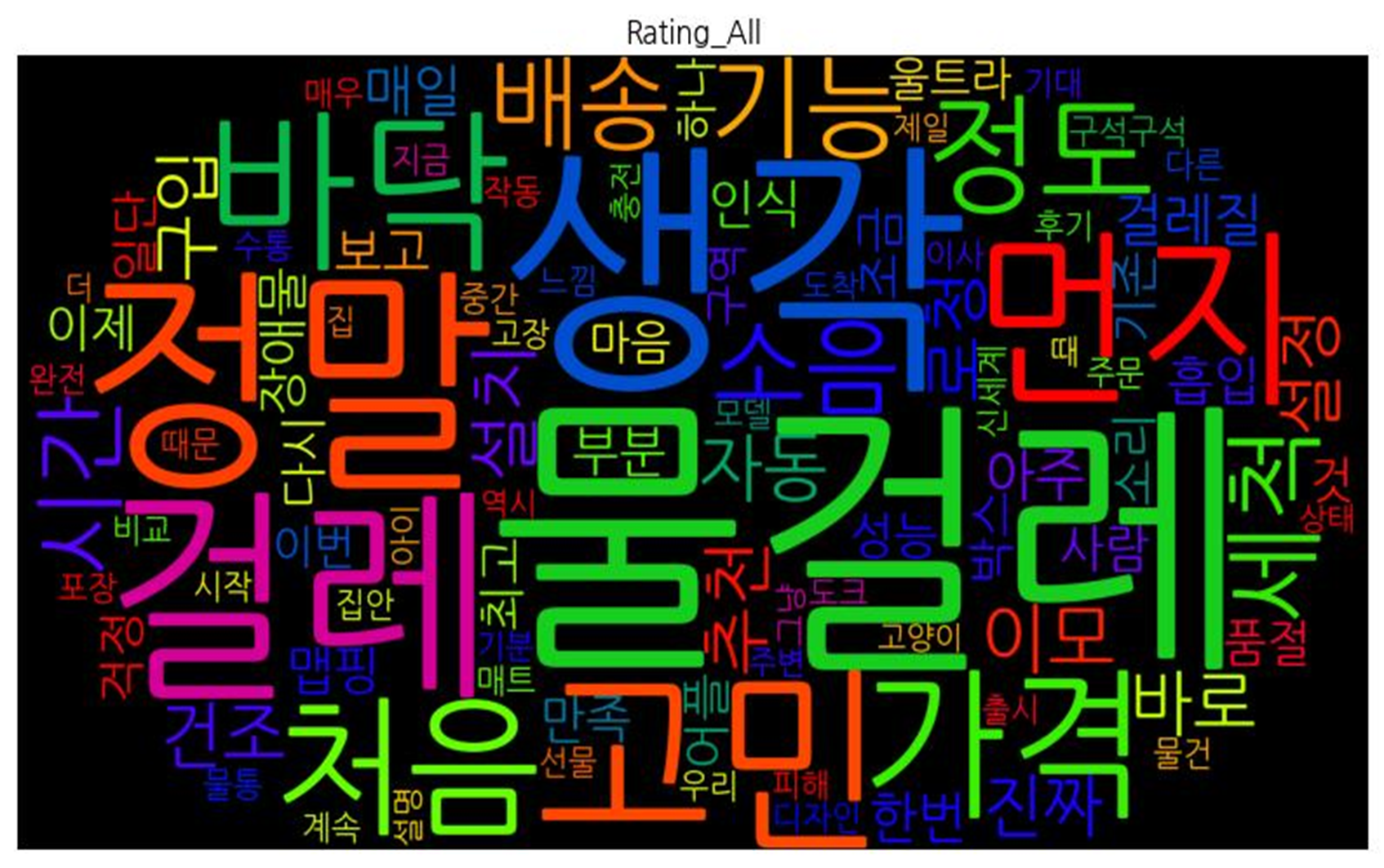 | 평점 전체 | ![]() [('물걸레', 1245), ('생각', 1058), ('정말', 817), ('걸레', 743), ('고민', 733), ('먼지', 660), ('바닥', 648), ('가격', 628), ('처음', 597), ('정도', 595), ('기능', 582), ('세척', 536), ('소음', 520), ('배송', 482), ('시간', 450), ('이모', 429), ('설치', 417), ('자동', 391), ('추천', 391), ('구입', 379), ('바로', 378), ('건조', 376), ('로청', 370), ('설정', 354), ('진짜', 337), ('걸레질', 329), ('아주', 328), ('한번', 314), ('매일', 312), ('보고', 297), ('부분', 291), ('장애물', 290), ('인식', 279), ('맵핑', 276), ('흡입', 274), ('어플', 269), ('만족', 268), ('이제', 268), ('사람', 257), ('성능', 247), ('최고', 246), ('박스', 243), ('조금', 243), ('다시', 240), ('소리', 238), ('걱정', 237), ('품절', 236), ('것', 236), ('기존', 235), ('일단', 235), ('울트라', 234), ('이번', 231), ('마음', 229), ('하나', 221), ('구역', 217), ('구석구석', 214), ('도크', 212), ('집', 211), ('시작', 209), ('다른', 208), ('수통', 205), ('집안', 204), ('작동', 202), ('계속', 201), ('신세계', 200), ('이사', 198), ('매우', 194), ('물건', 190), ('때문', 189), ('지금', 188), ('중간', 186), ('디자인', 186), ('후기', 186), ('비교', 184), ('물통', 181), ('매트', 179), ('충전', 176), ('느낌', 173), ('때', 173), ('그냥', 170), ('아이', 169), ('포장', 168), ('우리', 167), ('선물', 161), ('출시', 158), ('완전', 158), ('기대', 156), ('기분', 156), ('주문', 156), ('모델', 155), ('설명', 155), ('고장', 154), ('피해', 151), ('더', 150), ('주변', 146), ('고양이', 145), ('도착', 145), ('제일', 145), ('역시', 144), ('상태', 143)] |