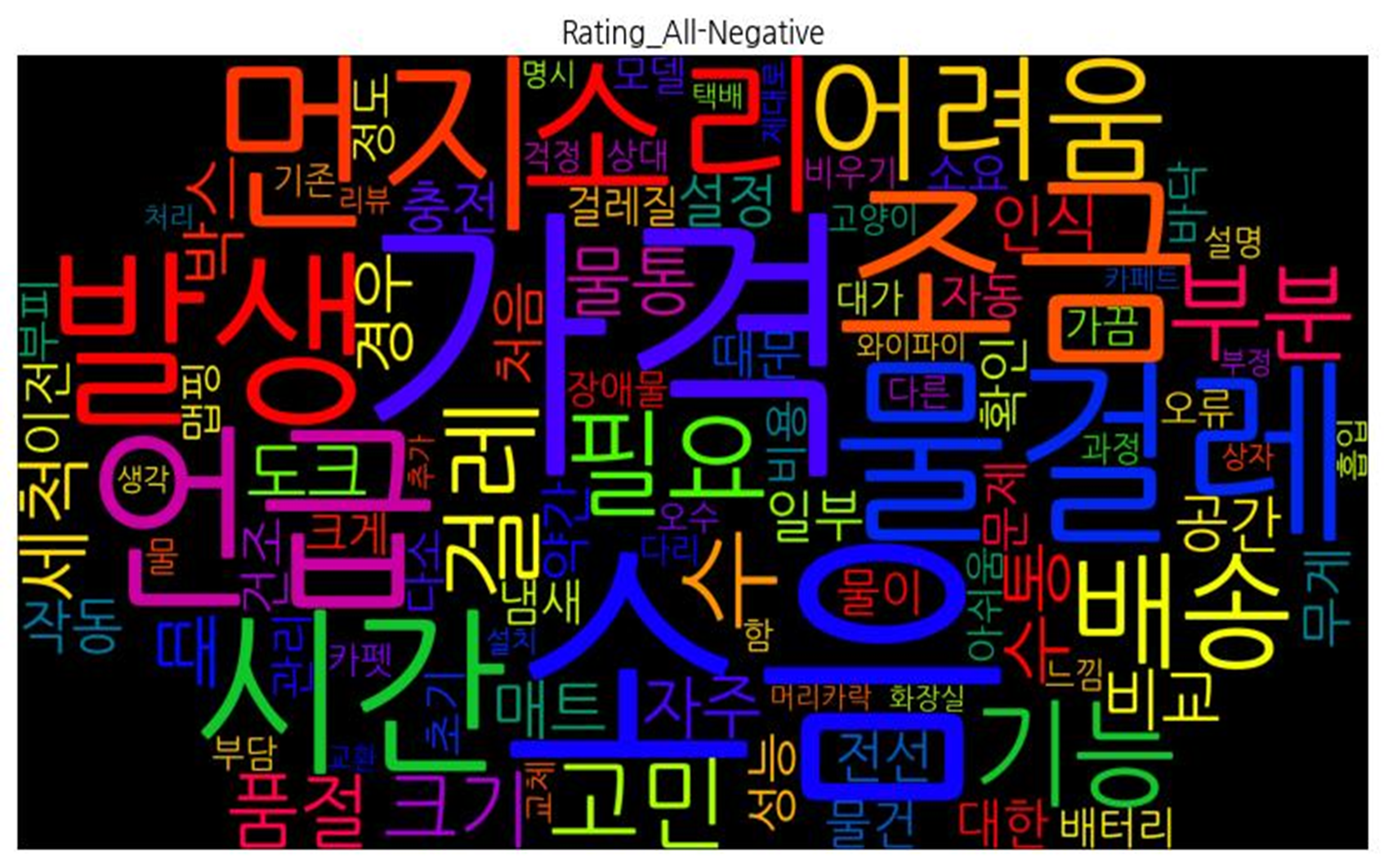 | 부정 속성 | ![]() [('소음', 248), ('가격', 247), ('조금', 105), ('언급', 101), ('물걸레', 99), ('먼지', 96), ('발생', 95), ('시간', 87), ('소리', 80), ('어려움', 73), ('배송', 62), ('기능', 53), ('필요', 51), ('걸레', 48), ('수', 48), ('부분', 46), ('고민', 46), ('크기', 44), ('품절', 41), ('세척', 41), ('때', 39), ('수통', 37), ('물통', 37), ('박스', 34), ('도크', 32), ('자주', 32), ('비교', 32), ('경우', 31), ('매트', 31), ('인식', 28), ('공간', 27), ('작동', 26), ('설정', 25), ('일부', 24), ('전선', 24), ('충전', 24), ('처음', 24), ('무게', 23), ('약간', 23), ('성능', 23), ('이전', 22), ('대한', 22), ('확인', 22), ('건조', 22), ('물건', 22), ('때문', 22), ('물이', 20), ('문제', 20), ('정도', 20), ('냄새', 20), ('자동', 19), ('크게', 19), ('초기', 19), ('관리', 19), ('소요', 19), ('비용', 18), ('바닥', 18), ('다소', 18), ('부피', 18), ('맵핑', 17), ('배터리', 17), ('걸레질', 17), ('가끔', 16), ('오류', 16), ('아쉬움', 16), ('모델', 16), ('장애물', 16), ('대가', 16), ('물', 16), ('부담', 15), ('카펫', 15), ('기존', 14), ('오수', 14), ('비우기', 14), ('상대', 14), ('다른', 14), ('함', 14), ('고양이', 13), ('설명', 13), ('느낌', 13), ('흡입', 13), ('교체', 13), ('과정', 13), ('다리', 13), ('걱정', 13), ('와이파이', 13), ('명시', 13), ('상자', 12), ('리뷰', 12), ('부정', 12), ('제대로', 12), ('생각', 12), ('추가', 12), ('설치', 12), ('화장실', 11), ('머리카락', 11), ('택배', 11), ('처리', 11), ('카페트', 11), ('교환', 11)] |