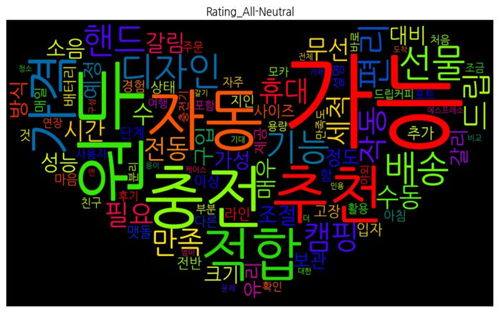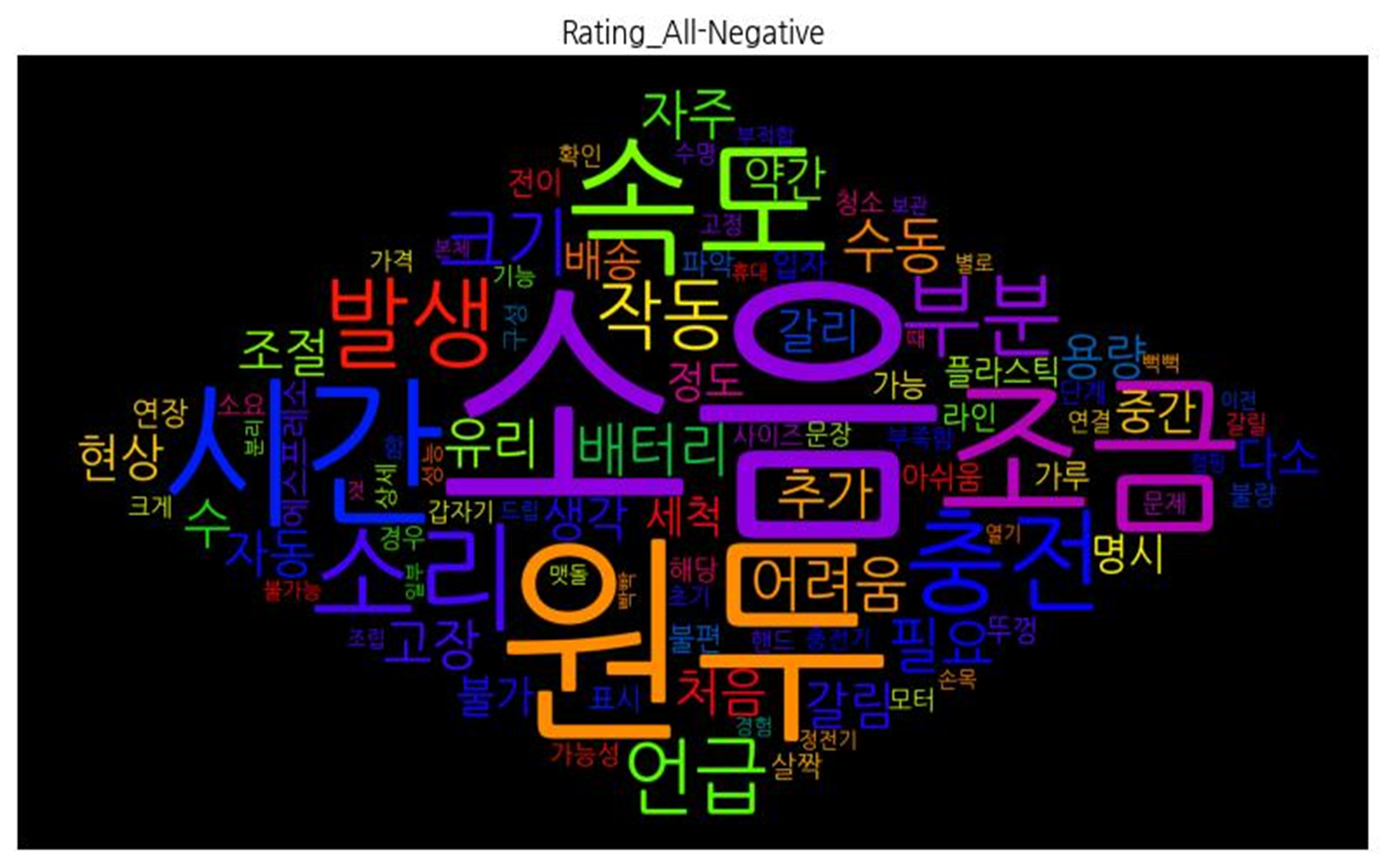 | 부정 속성 | ![]() [('소음', 142), ('원두', 128), ('조금', 121), ('시간', 108), ('속도', 90), ('소리', 82), ('충전', 74), ('발생', 56), ('부분', 46), ('언급', 44), ('작동', 37), ('크기', 35), ('어려움', 33), ('필요', 33), ('수동', 32), ('배터리', 31), ('고장', 28), ('자주', 27), ('유리', 27), ('추가', 27), ('수', 27), ('갈림', 24), ('처음', 24), ('조절', 24), ('자동', 24), ('현상', 23), ('용량', 22), ('생각', 22), ('약간', 21), ('다소', 21), ('갈리', 21), ('중간', 20), ('정도', 19), ('불가', 19), ('세척', 19), ('배송', 19), ('명시', 18), ('플라스틱', 18), ('에스프레소', 17), ('연장', 17), ('라인', 16), ('가루', 16), ('전이', 16), ('입자', 16), ('가능', 15), ('아쉬움', 15), ('불편', 15), ('파악', 14), ('표시', 14), ('뚜껑', 14), ('살짝', 13), ('청소', 12), ('소요', 12), ('해당', 12), ('경우', 11), ('불량', 11), ('구성', 11), ('모터', 11), ('단계', 11), ('사이즈', 11), ('문장', 11), ('가능성', 11), ('크게', 10), ('문제', 10), ('초기', 10), ('확인', 10), ('기능', 10), ('핸드', 10), ('가격', 10), ('부족함', 10), ('연결', 10), ('상세', 10), ('갑자기', 10), ('고정', 10), ('충전기', 10), ('함', 10), ('갈릴', 9), ('성능', 9), ('수명', 9), ('드립', 8), ('경험', 8), ('조립', 8), ('불가능', 8), ('별로', 8), ('맷돌', 8), ('정전기', 8), ('뻑뻑', 8), ('부적합', 8), ('손목', 8), ('때', 8), ('분리', 7), ('캠핑', 7), ('이전', 7), ('열기', 7), ('일부', 7), ('본체', 7), ('보관', 7), ('빡빡', 7), ('휴대', 7), ('것', 7)] |