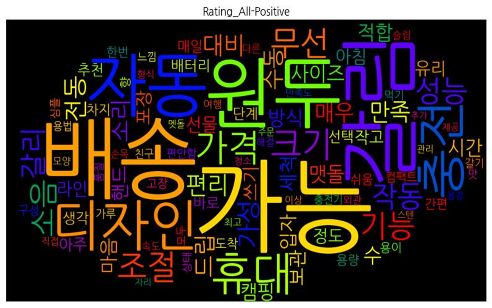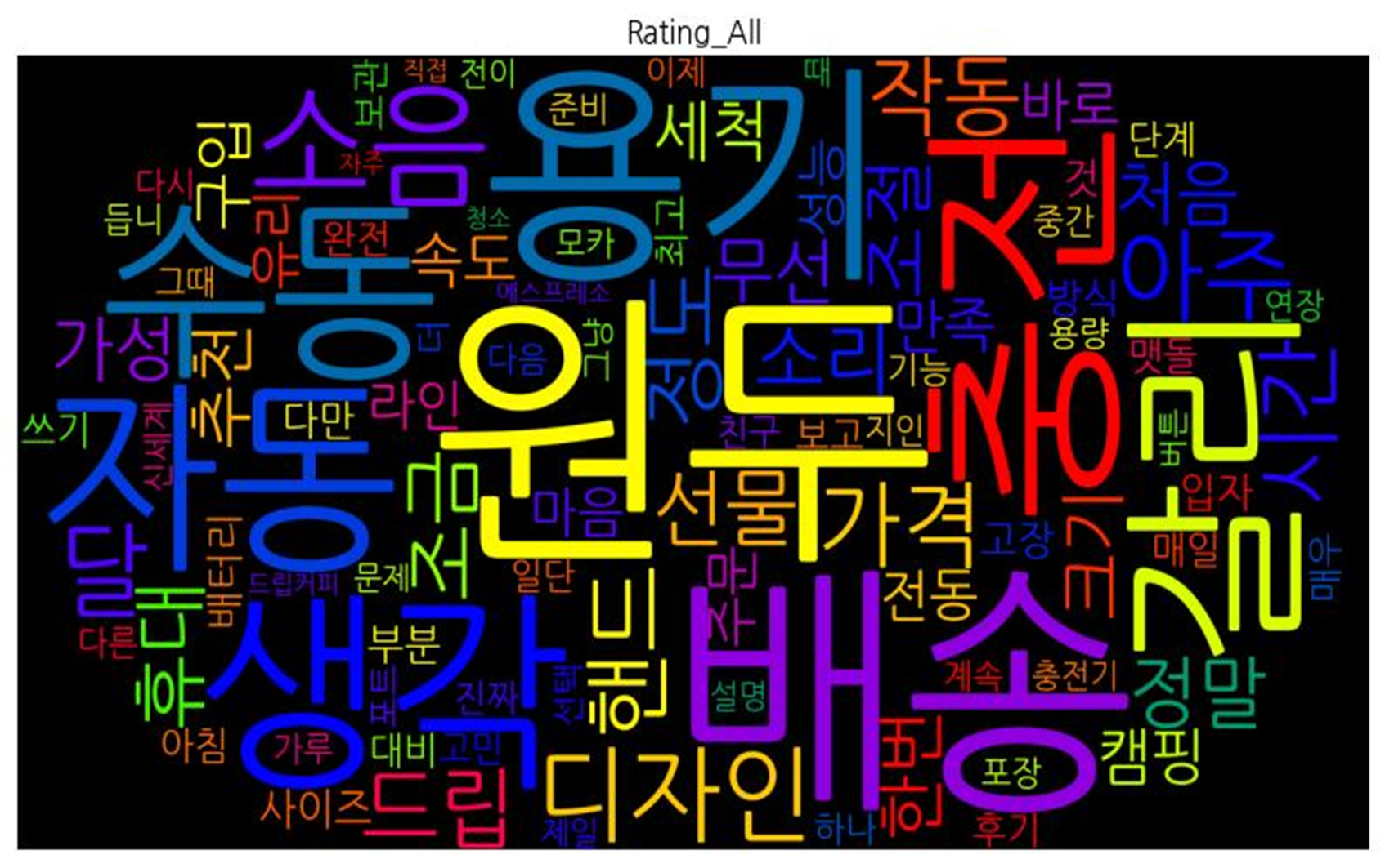 | 평점 전체 | ![]() [('원두', 711), ('배송', 587), ('용기', 443), ('충전', 406), ('생각', 371), ('자동', 346), ('갈리', 333), ('수동', 302), ('소음', 283), ('디자인', 271), ('달', 258), ('아주', 252), ('가격', 216), ('핸드', 216), ('시간', 207), ('정도', 195), ('드립', 190), ('작동', 189), ('선물', 188), ('조금', 184), ('휴대', 182), ('소리', 181), ('정말', 181), ('조절', 169), ('크기', 151), ('가성', 151), ('한번', 148), ('무선', 147), ('처음', 144), ('추천', 138), ('세척', 135), ('캠핑', 134), ('구입', 133), ('속도', 131), ('만족', 123), ('바로', 116), ('전동', 114), ('주문', 111), ('라인', 110), ('유리', 110), ('마음', 107), ('성능', 106), ('사이즈', 100), ('방식', 98), ('고장', 96), ('부분', 96), ('배터리', 95), ('것', 94), ('입자', 93), ('다만', 91), ('쓰기', 85), ('대비', 83), ('맷돌', 83), ('보고', 82), ('단계', 81), ('보관', 81), ('아침', 80), ('더', 80), ('완전', 79), ('최고', 78), ('후기', 77), ('매일', 77), ('진짜', 70), ('매우', 70), ('일단', 67), ('고민', 66), ('기능', 66), ('친구', 64), ('하나', 63), ('포장', 58), ('다시', 58), ('다른', 58), ('지인', 57), ('다음', 57), ('듭니', 57), ('연장', 56), ('중간', 55), ('그냥', 55), ('선택', 54), ('용량', 54), ('준비', 54), ('가루', 53), ('포트', 52), ('계속', 51), ('이제', 51), ('그때', 51), ('모카', 49), ('설명', 46), ('충전기', 46), ('제일', 45), ('전이', 45), ('신세계', 45), ('때', 45), ('문제', 44), ('버튼', 44), ('에스프레소', 44), ('직접', 43), ('드립커피', 43), ('청소', 43), ('자주', 43)] |