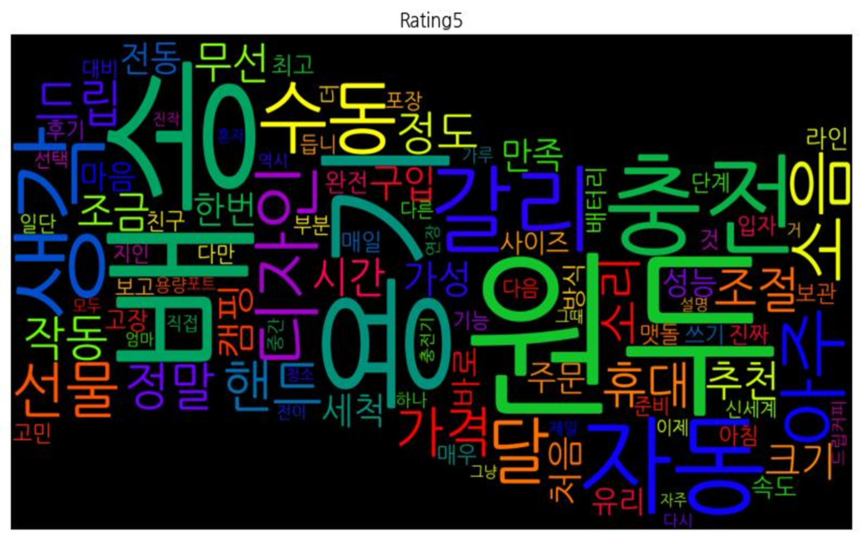 | 평점 5점 | ![]() [('원두', 555), ('배송', 503), ('용기', 373), ('충전', 304), ('자동', 283), ('생각', 277), ('갈리', 276), ('수동', 256), ('아주', 231), ('디자인', 223), ('달', 213), ('소음', 210), ('선물', 172), ('핸드', 169), ('가격', 162), ('정말', 158), ('휴대', 148), ('드립', 148), ('조절', 147), ('작동', 143), ('소리', 140), ('정도', 138), ('무선', 129), ('추천', 126), ('시간', 125), ('조금', 120), ('캠핑', 118), ('크기', 115), ('가성', 114), ('구입', 113), ('처음', 110), ('세척', 109), ('한번', 107), ('만족', 104), ('전동', 102), ('주문', 100), ('바로', 97), ('마음', 93), ('성능', 91), ('유리', 87), ('사이즈', 87), ('방식', 84), ('속도', 80), ('고장', 74), ('라인', 74), ('완전', 74), ('최고', 72), ('배터리', 72), ('매일', 68), ('보관', 67), ('진짜', 65), ('맷돌', 65), ('쓰기', 64), ('더', 64), ('것', 64), ('아침', 63), ('매우', 63), ('단계', 60), ('입자', 60), ('후기', 60), ('보고', 60), ('고민', 59), ('친구', 59), ('다만', 55), ('일단', 53), ('다음', 52), ('대비', 52), ('지인', 51), ('기능', 50), ('부분', 49), ('듭니', 49), ('포장', 48), ('준비', 46), ('선택', 43), ('신세계', 43), ('다른', 42), ('이제', 41), ('직접', 39), ('용량', 38), ('가루', 38), ('중간', 38), ('하나', 38), ('드립커피', 37), ('다시', 36), ('전이', 36), ('역시', 36), ('연장', 36), ('거', 36), ('충전기', 35), ('포트', 35), ('제일', 35), ('설명', 34), ('청소', 34), ('그때', 34), ('엄마', 34), ('모두', 34), ('진작', 33), ('혼자', 32), ('그냥', 32), ('자주', 32)] |