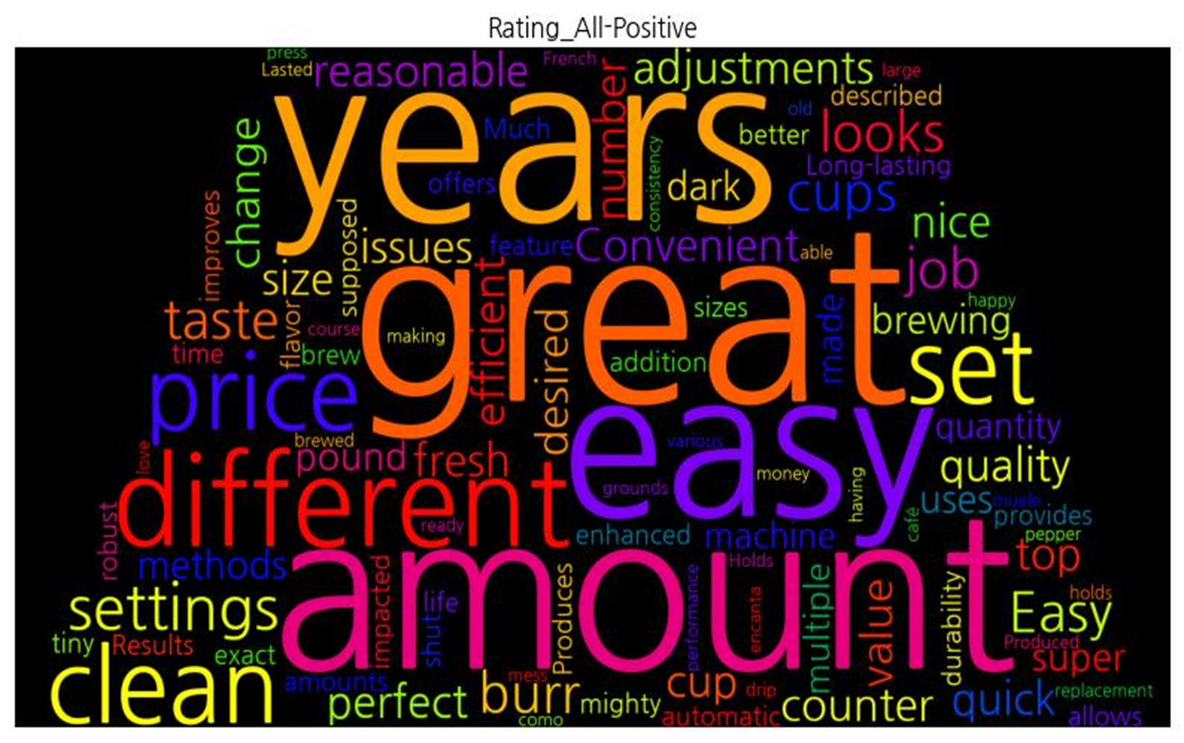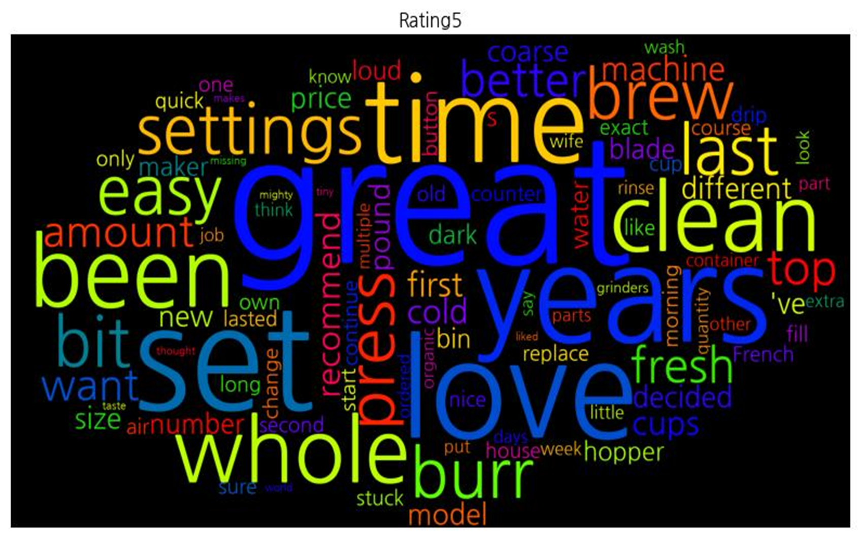 | 평점 5점 | ![]() [('great', 13), ('set', 8), ('love', 7), ('years', 7), ('time', 7), ('been', 6), ('clean', 6), ('whole', 6), ('settings', 5), ('last', 5), ('easy', 5), ('press', 5), ('brew', 5), ('burr', 5), ('bit', 5), ('better', 4), ('fresh', 4), ('top', 4), ('amount', 4), ('want', 4), ('machine', 4), ('recommend', 4), ('first', 4), ('cups', 4), ('cold', 4), ('different', 3), ('size', 3), ('coarse', 3), ('model', 3), ("'ve", 3), ('price', 3), ('decided', 3), ('new', 3), ('pound', 3), ('number', 3), ('blade', 3), ('hopper', 3), ('loud', 3), ('water', 3), ('maker', 3), ('dark', 3), ('s', 3), ('bin', 3), ('own', 2), ('quick', 2), ('second', 2), ('like', 2), ('cup', 2), ('fill', 2), ('start', 2), ('air', 2), ('house', 2), ('replace', 2), ('exact', 2), ('nice', 2), ('morning', 2), ('only', 2), ('sure', 2), ('lasted', 2), ('drip', 2), ('French', 2), ('long', 2), ('course', 2), ('old', 2), ('change', 2), ('stuck', 2), ('continue', 2), ('button', 2), ('one', 2), ('counter', 2), ('container', 2), ('put', 2), ('wife', 2), ('look', 2), ('little', 2), ('job', 2), ('think', 2), ('days', 2), ('wash', 2), ('parts', 2), ('part', 2), ('week', 2), ('multiple', 2), ('quantity', 2), ('organic', 2), ('ordered', 2), ('say', 2), ('other', 2), ('rinse', 2), ('extra', 2), ('know', 2), ('grinders', 2), ('thought', 1), ('liked', 1), ('missing', 1), ('makes', 1), ('taste', 1), ('world', 1), ('tiny', 1), ('mighty', 1)] |