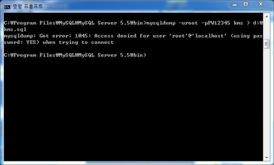 2. MySQL이 설치된 폴더(현재[2012.11.10]의 경우 'C:Program Files\MySQL\MySQL Server 5.5\bin')로 이동한다.